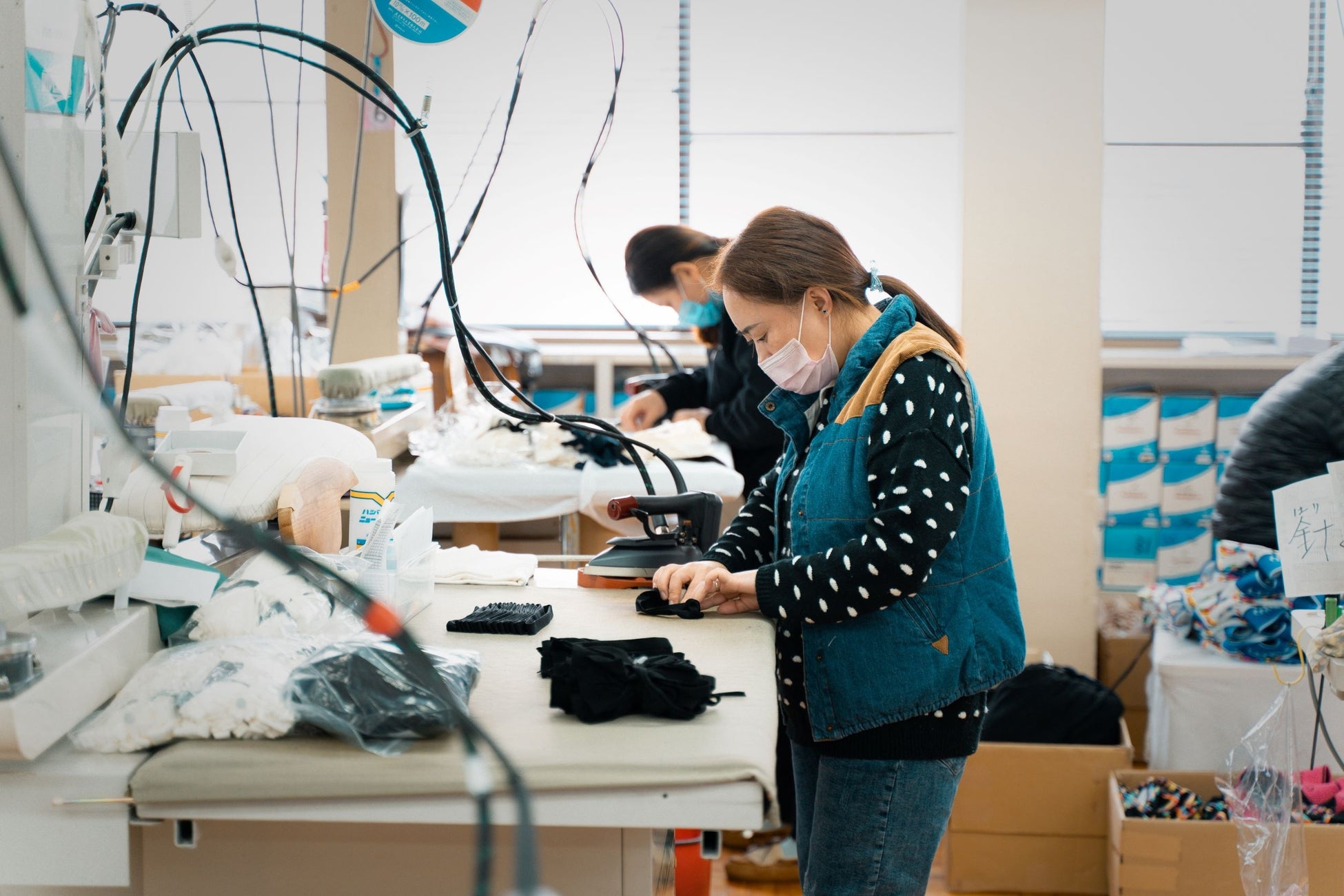 当社の商品は高級ブランドを手掛ける老舗工場で、熟練の職人が一枚一枚、丁寧に縫製しています。(衣料品の国内生産は僅か2.3%)