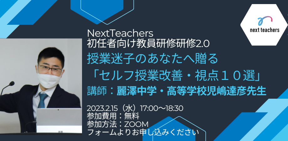 【教員志望学生・若手教員向け無料WEB研修会】授業迷子のあなたへ贈る「セルフ授業改善・視点10選」講師:児嶋達彦 先生 2023年2月15日(水)17時〜開催