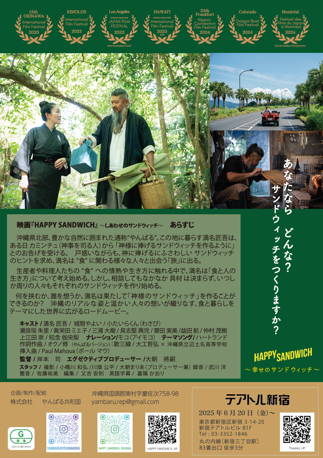 やんばる共和国(所在地:沖縄県国頭郡)が制作した、沖縄のリアルな姿と温かい人々の想いを描くドキュメンタリードラマ映画『HAPPY SANDWICH〜幸せのサンドウィッチ〜』が、テアトル梅田(2025/07/11〜7/17)での上映が決定いたしました。本作品は、沖縄本島北部「やんばる」を舞台に、神様に捧げるサンドウィッチを作る旅を通して、食と人、自然との繋がりを描いたロードムービーです。何を挟むか、誰を想うか、登場人物それぞれの「ハッピーサンドウィッチ」を通して、観る人すべての心が温かくなることでしょう。(2025/07/09記)
