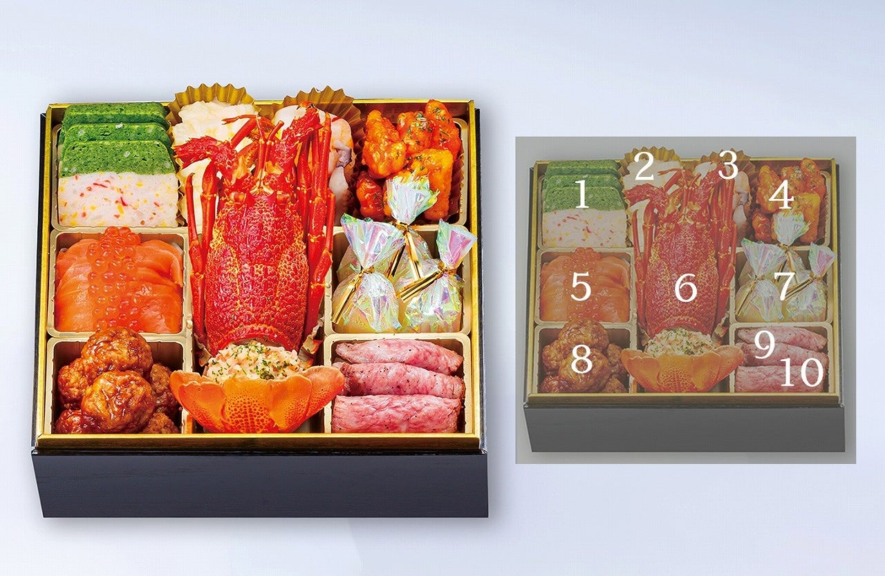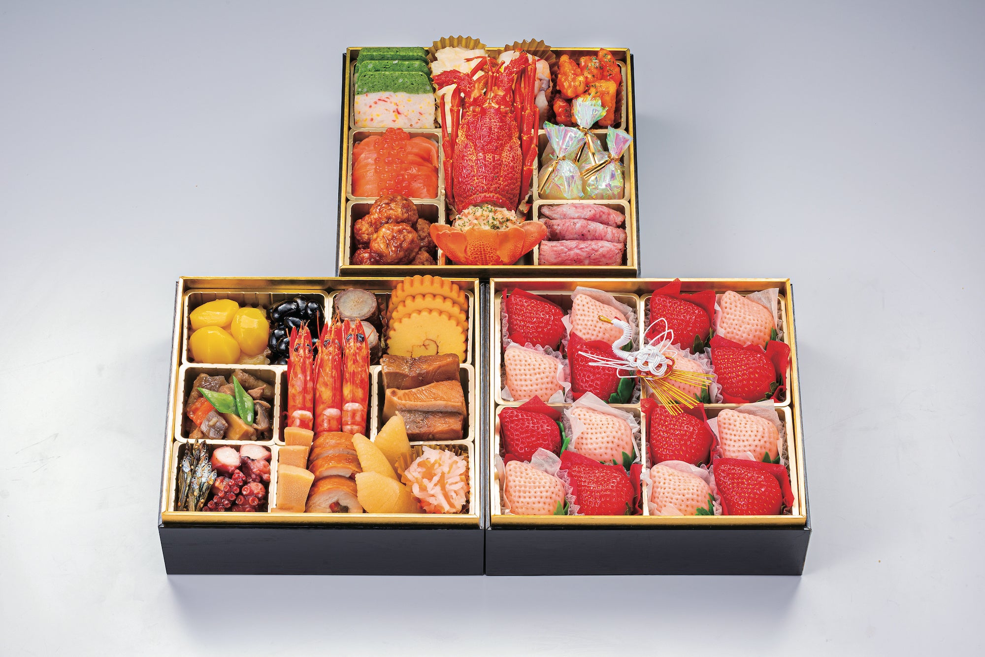 A5ランクの宮崎牛ローストビーフ、豊後鶏の筑前煮、大分県かぼすぶりの照り焼き、佐賀県産あわゆき、または佐賀県産ゆきうさぎ他、魅力たっぷりの全23品。最大の特徴は紅白苺。定番のおせち料理に福岡名産、いちごの王様「あまおう」と、白苺を盛り付け、さらに華やかで、新年を迎えるにふさわしい3段のお重です。