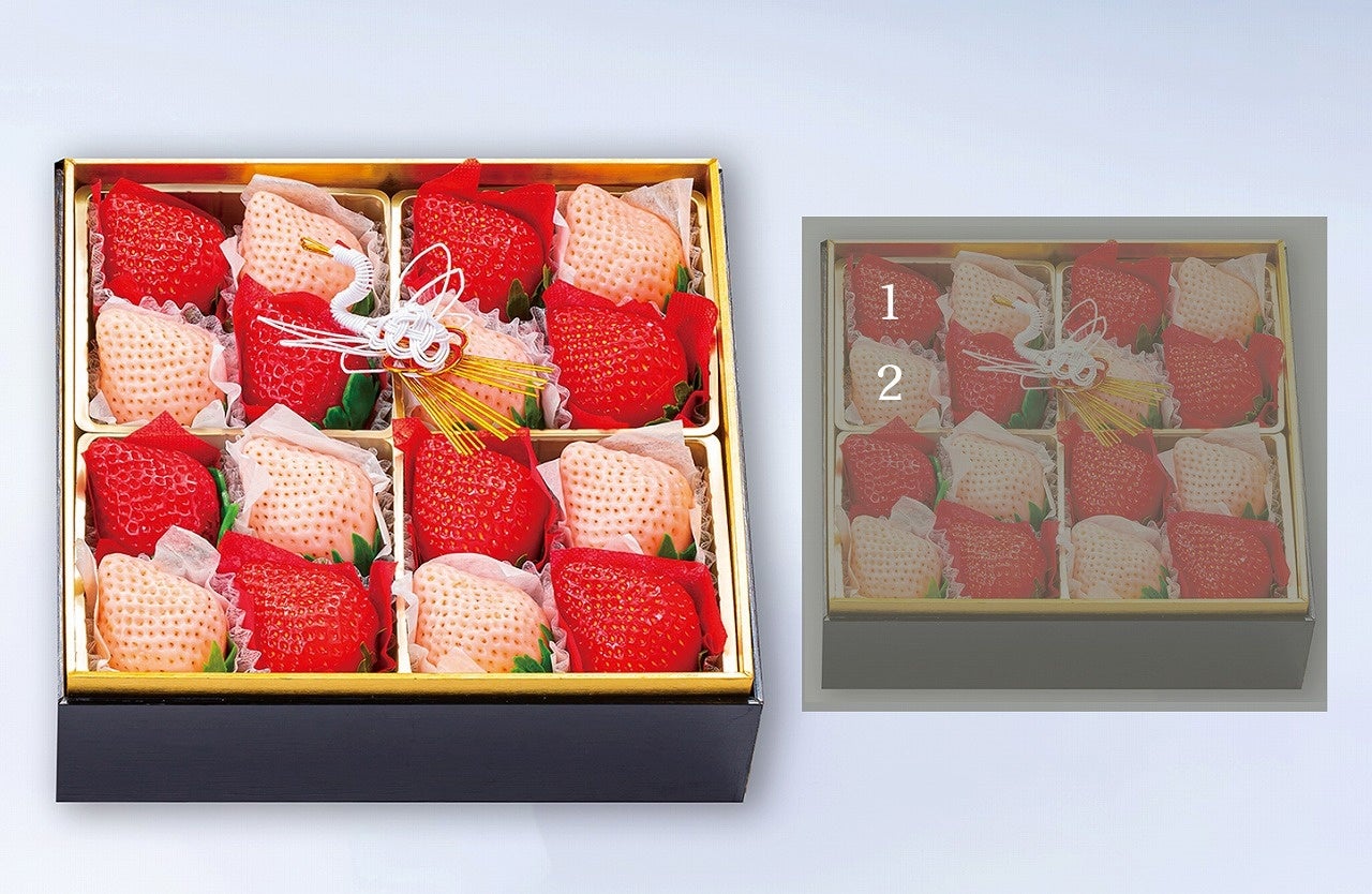 おめでたい紅白の苺を市松模様に。フルーツ屋さんが手がける今までに無い新たなお節をご提案します。