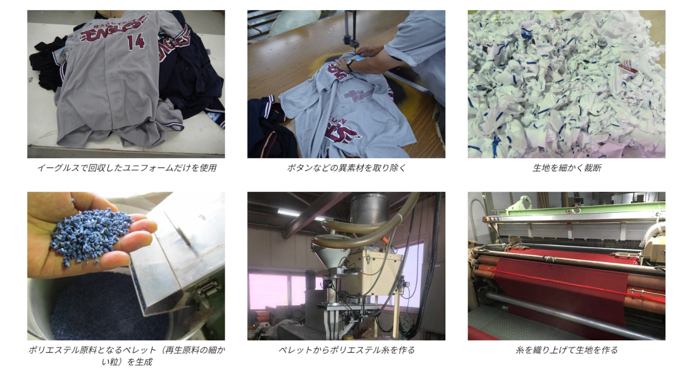 過去にはユニフォームリサイクルプロジェクトにてマテリアルリサイクルの技術を提供。合計7,315枚のユニフォームから楽天イーグルスオリジナルのリサイクルエコバッグを制作。