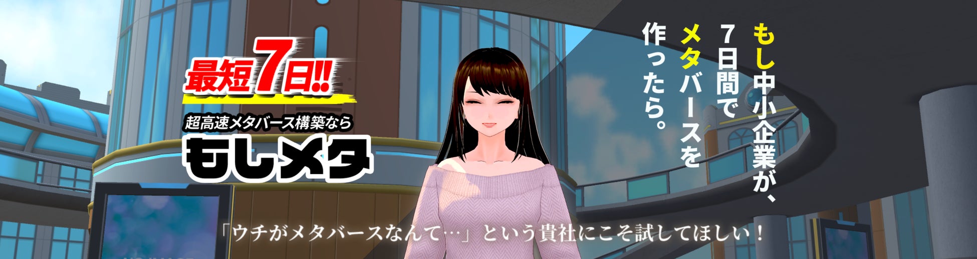 「Techway METAVIEWN」シリーズの中でも中小企業向けを想定したメタバース構築サービスのこと。これまでビジネス用メタバースを作るには数カ月、月額10万円以上がかかり、事実上、大企業の利用にとどまっていました。「もしメタ」はこの常識を覆し、構築は国内最短の7営業日、価格は月2,980円(10ユーザーまで)を実現。申し込みから7日後には、中小企業もメタバース市場で戦える環境をお届けします。