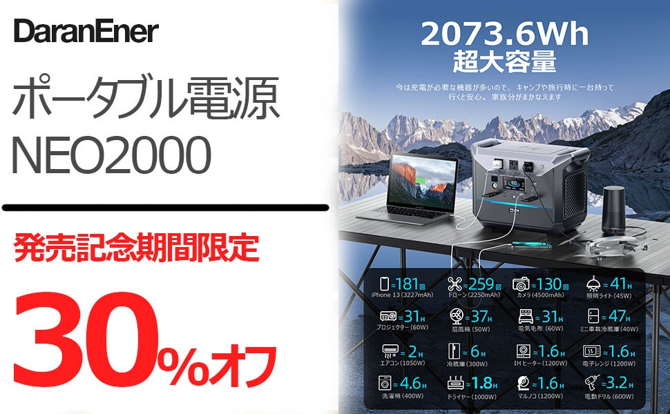 「7日間限定30%OFF」DaranEnerが2073.6Whの超大容量&1.8時間満充電!リン酸鉄リチウムで⻑寿命ポータブル電源「NEO2000」を発売開始!