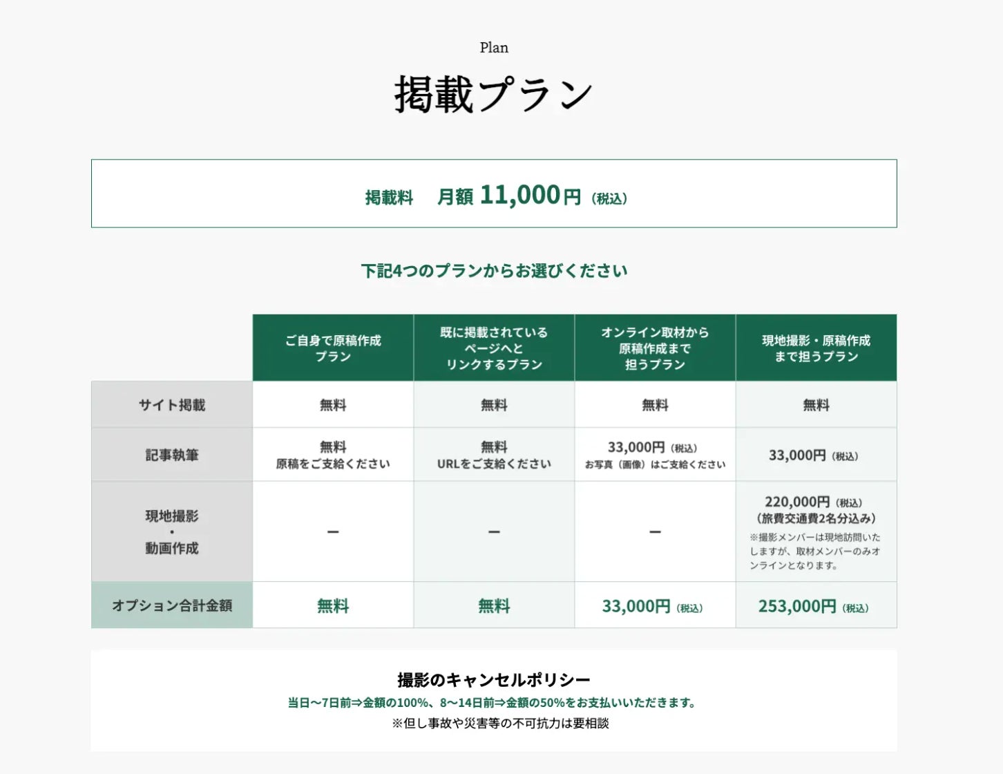 ※必要に応じて取材・ライティング費用や動画撮影・編集費用といったオプション料金を実費でお支払いいただきます。