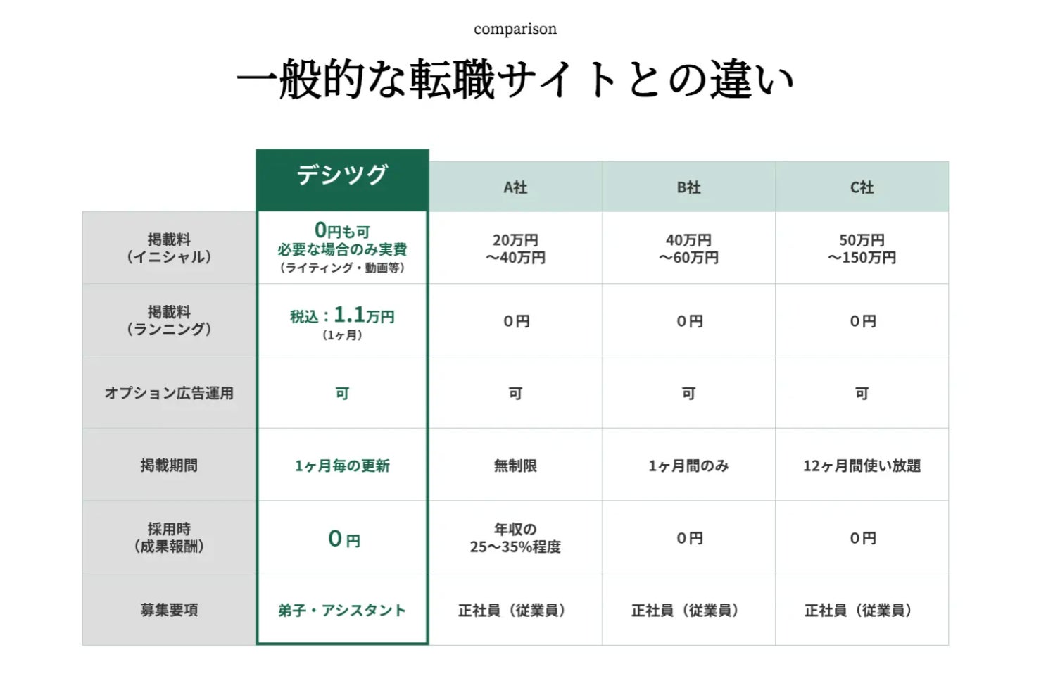 掲載におけるイニシャルコストを抑えることができる点は、デシツグの強みの一つ。一般的な転職サイトの場合、安くても20万円以上はかかる初期コストがデシツグの場合は無料です。(※)