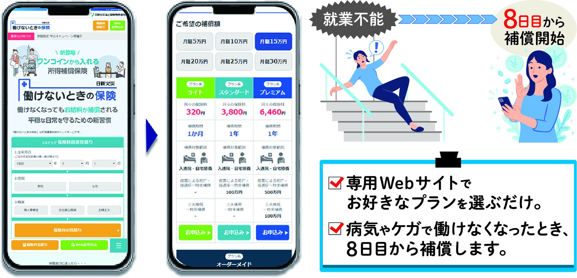 こうした背景を踏まえ、このたび多種多様な働き手の方に短期の就業不能リスクに備えていただくことができる「働けないときの保険」を発売することといたしました。本商品は、Web上で申込み手続きが完結(業界初(*4))するため、忙しい方が手軽にいつでも加入することが可能です。