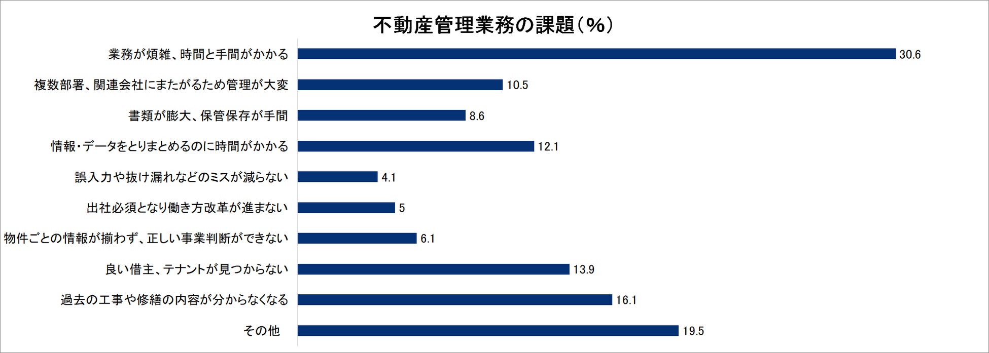 - 不動産管理における課題は「業務が煩雑、時間と手間がかかる」が最多。「過去の工事や修繕の内容が分からなくなる」「複数部署、関連会社にまたがるため管理が大変」などの回答も多く、情報管理や業務効率の必要性が高い状況が見える。