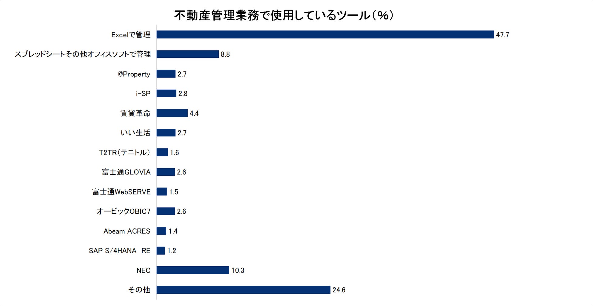 不動産管理業務において、最も使用されているのは「Excel」(47.7%)。管理不動産の目的や棟数により、何のツールを使うかは細分化する傾向。