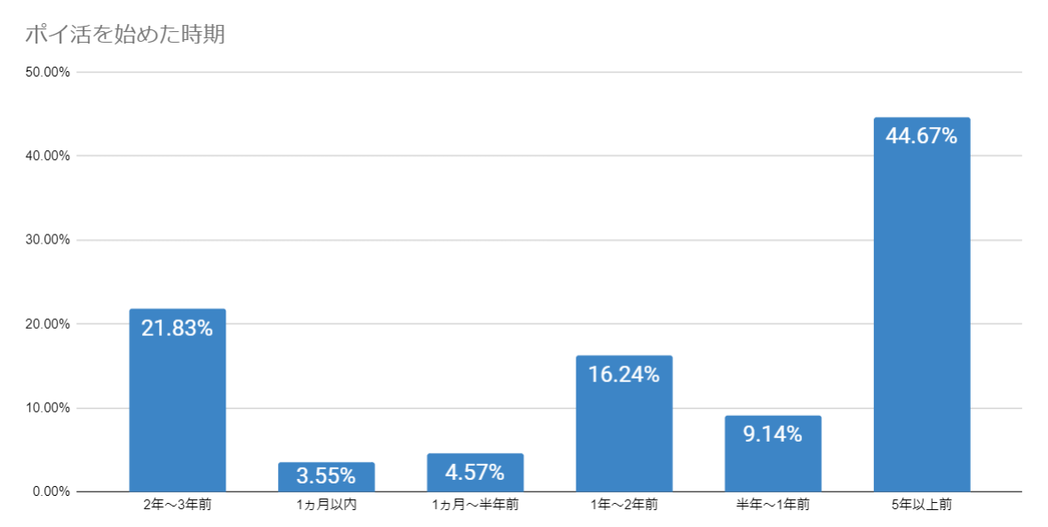 60%以上の方が少なくとも2年前からポイ活をスタートされているということで、全体の傾向としてはポイ活ベテランの方からのご回答を多くいただけているものと推測されます。