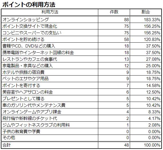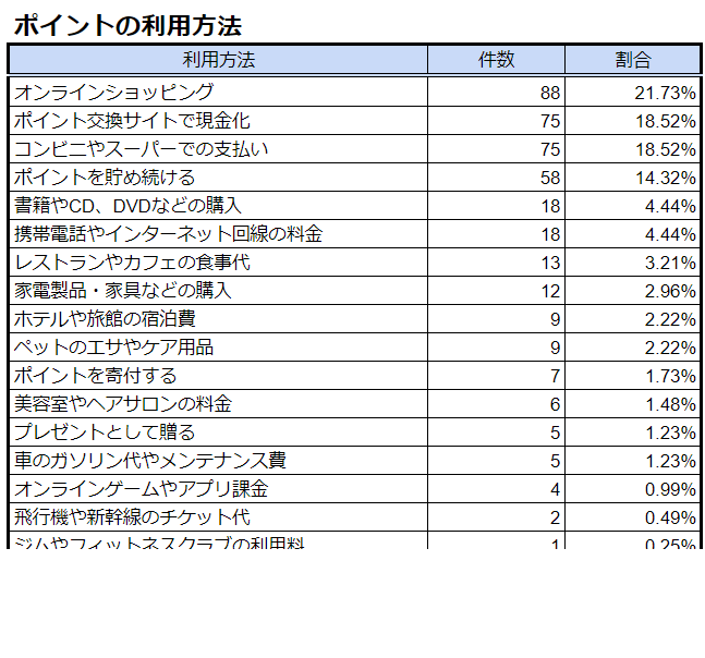 貯めたポイントはどのような用途に利用しているのでしょう?続いて、ポイントの利用方法について調査してみました。
