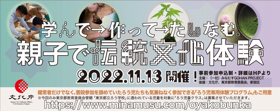 文化庁の委託事業として一般社団法人みなむすGOHAN PROJECT(代表理事:高橋桂子)が主催する日本の伝統文化を健常者だけでなく普段参加を諦めていた「ろう児」たちも気兼ねなく体験できる親子イベントを11/13開催
