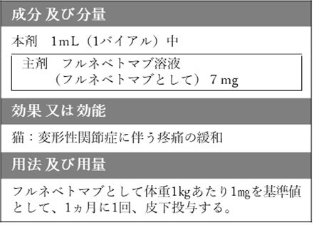 ・製品特徴:猫の変形性関節症に伴う疼痛の緩和。1ヵ月に1回皮下投与。