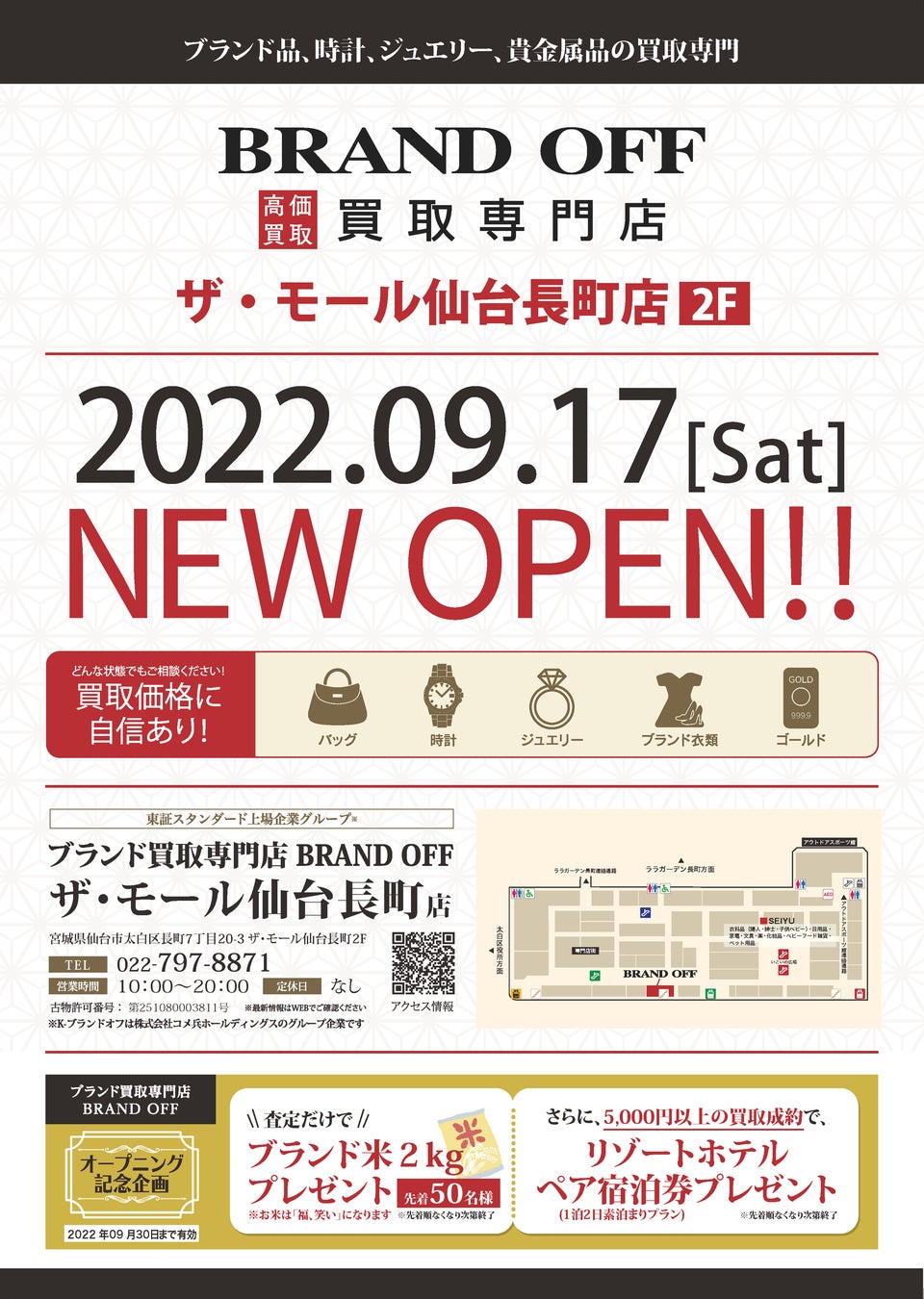 ブランドリユースNo.1(※)のコメ兵ホールディングスグループの一翼である株式会社K-ブランドオフ(石川県金沢市)は、宮城県仙台市のザ・モール仙台長町2Fに「BRAND OFF 買取専門 ザ・モール仙台長町店(FC)」をオープンいたします。宮城県では初の出店となります。