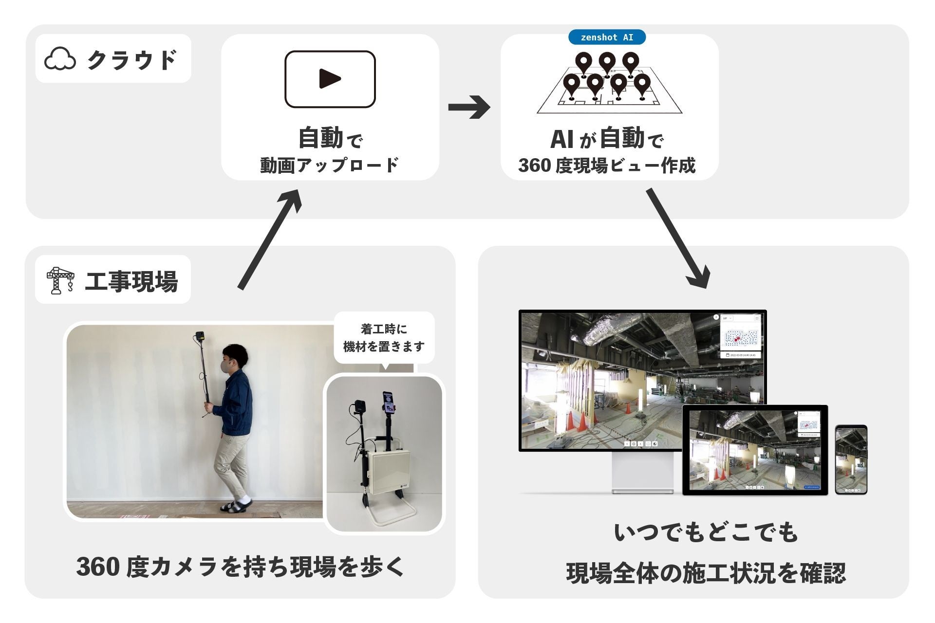 zenshotは、カメラを持って建築現場を歩くだけで画像処理AIが360度現場ビューを自動で作成するサービスです。