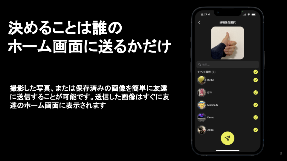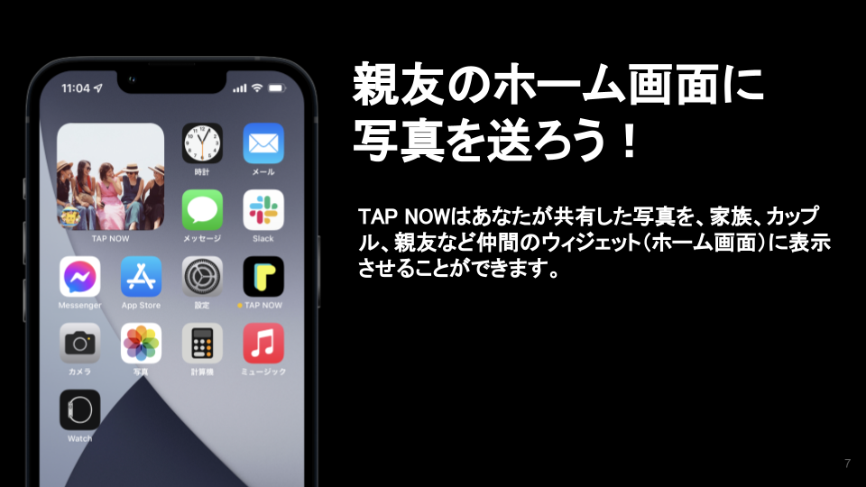ふとした瞬間にホーム画面の写真が更新されている楽しさや、アプリを開くことなくウィジェット上で写真共有できる便利さ、送りたい人にだけシェアできる特別感が特徴で、恋人と日常の出来事や仲間同士で面白い写真を共有し、大切な人との繋がりを感じることができます。