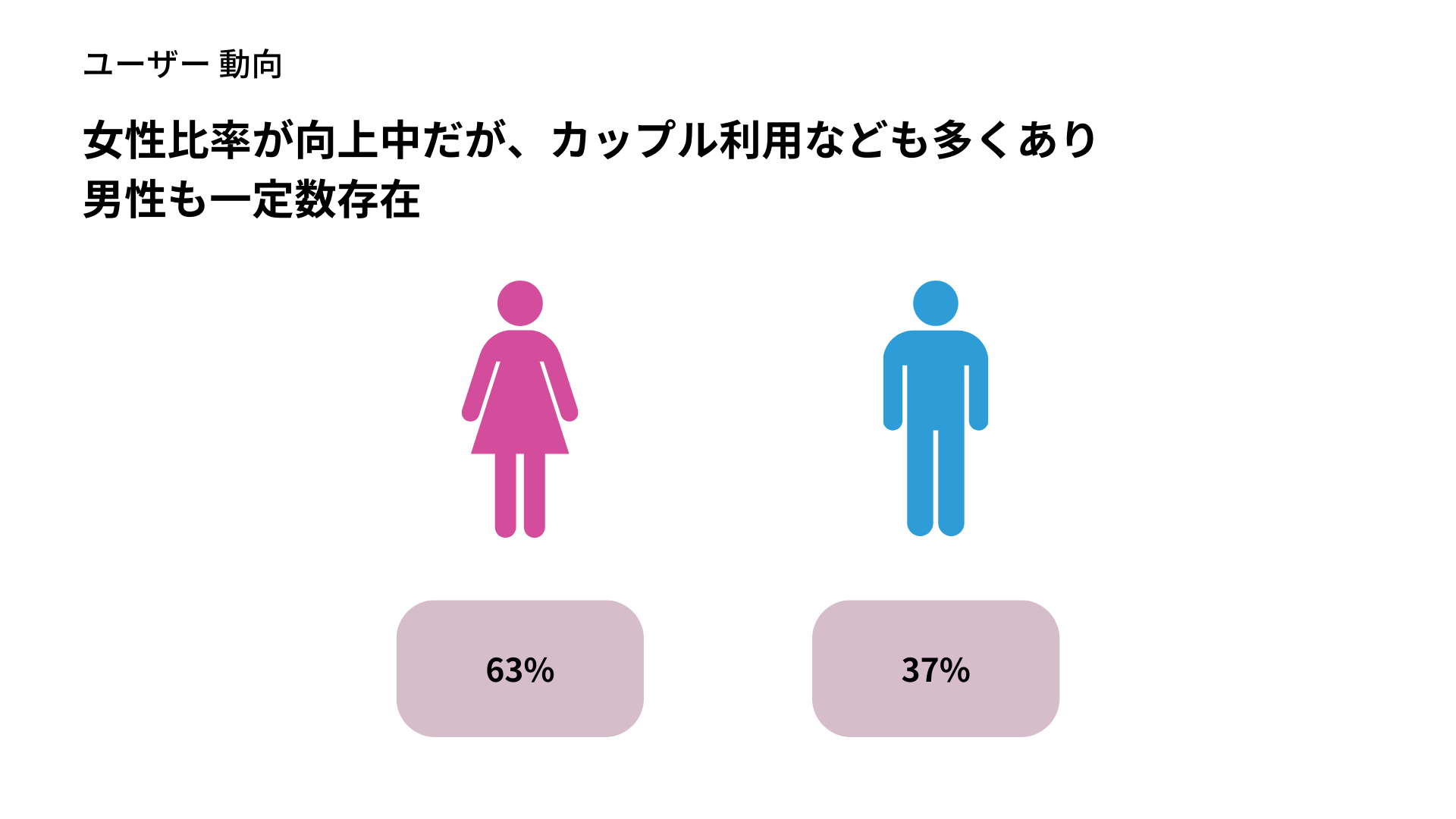 ユーザーは女性比率が向上中ですが、カップル利用なども多くあり、男性も一定数増加しています。