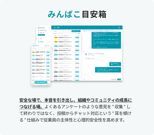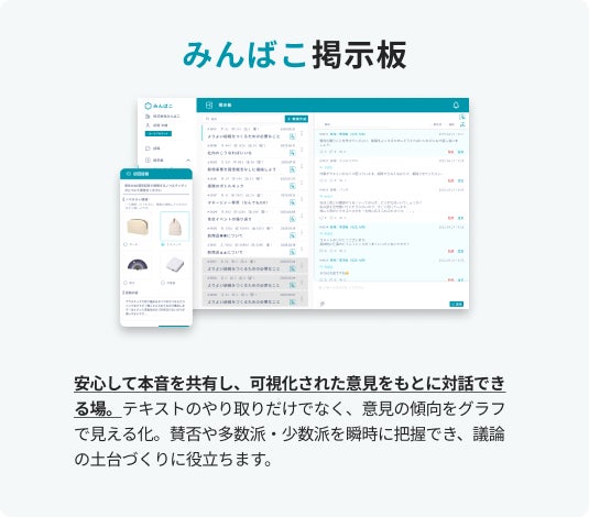 今後は、匿名で本音を引き出す「みんばこ目安」と、議論を深める「みんばこ掲示板」の二つの機能を軸に、利用企業の拡大とサービス改善をさらに進めていきます。正しい情報にもとづき正しい判断ができる組織運営を標準化し、「声が集まり、議論が生まれ、意思決定が進む」循環を、より自然に、より当たり前にすることを目指してまいります。