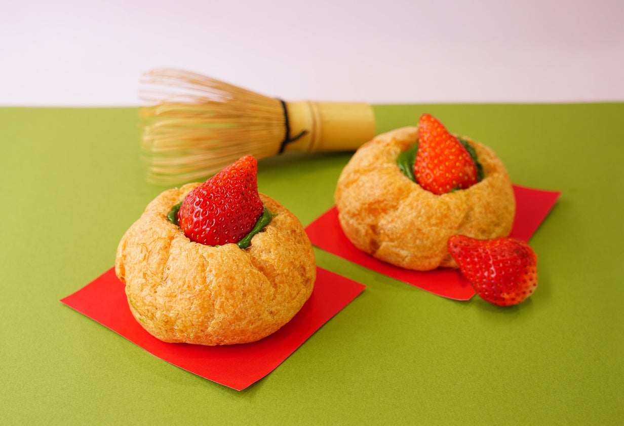 【春限定】お濃茶スイーツ専門店「雷一茶」が手掛ける、春めくふんわり抹茶スイーツ。桜&ストロベリーの「季節のお濃茶シュークリーム」が登場!