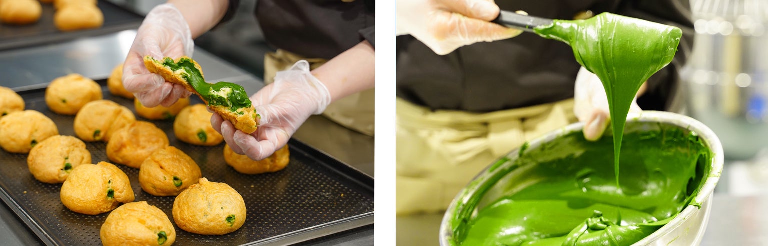 生地からとろり溢れる濃厚抹茶クリームは濃いながらも苦みが少なく、着色料や香料を使用せず、色鮮やかな抹茶本来の旨み・風味を味わえます。