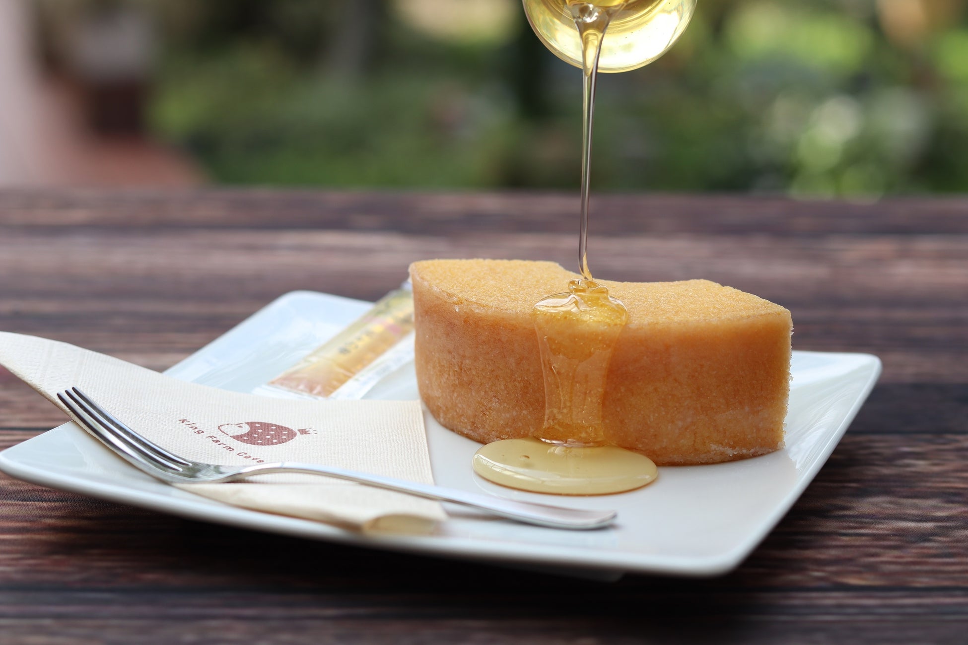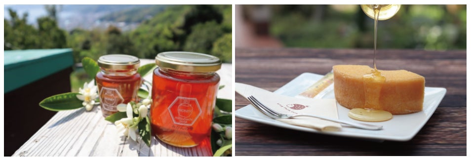 みつばちのーと天然ハチミツは、混ぜ物無し・高熱処理なし(50℃以下)の蜂蜜本来の自然な風味を味わって欲しい事と栄養を壊さないようにとの心遣い。代表の田中章雄氏は“はちみつを食べた方に笑顔や豊かさをご提供したい”という想いで生産から発送までを手仕事にこだわっており、とても貴重なハチミツを生産しています。この爽やかなハチミツの甘さがバウムクーヘンの卵の風味をより引き立たせたスイーツに仕上げます。