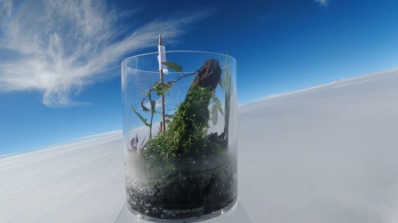 「めだか盆栽」はガラス水槽の中で水草を使って表現する現代風盆栽です。「めだか盆栽」を宇宙に打ち上げました。