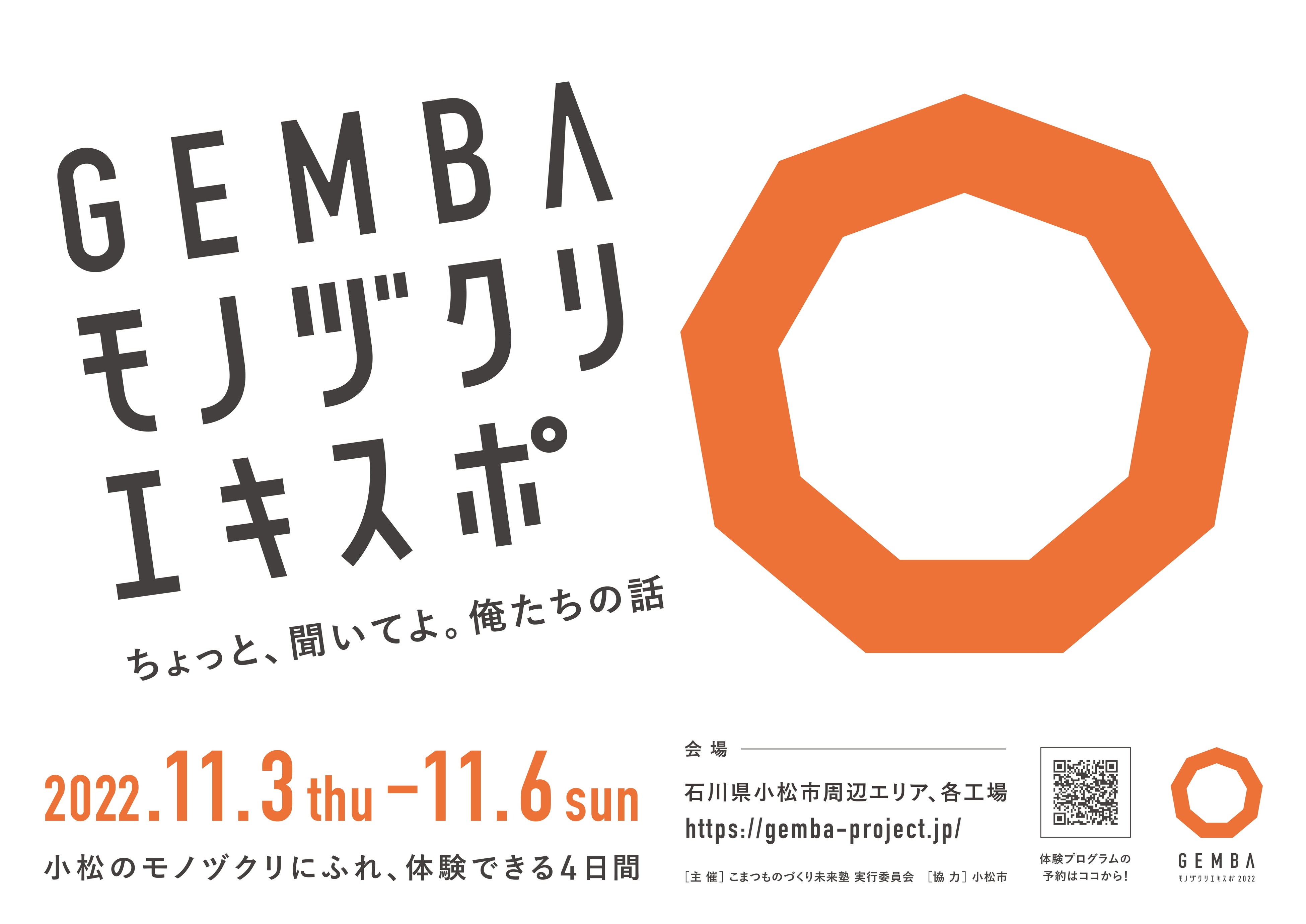 マッチングした複業人材の方は11⽉3⽇〜11⽉6⽇の期間、小松市で開催されるオープンファクトリーイベント「GEMBAモノヅクリエキスポ2022」にご招待。実際に小松市でモノを作る体験を経て、新規プロジェクトを検討いただくことが可能です。