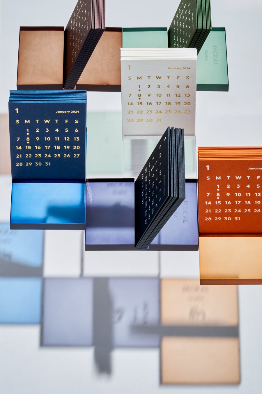 カレンダーカードは厚手の紙に必要な情報のみ表記され、そのサイズながら見やすくスッキリとしたミニマルデザイン。そして情報だけでなくルックスを統一させるため、台座はカレンダーカードのカラーに合わせ、一つひとつ手作業で染めています。天面は鏡面加工、側面はブラスト加工でマットに。光の当たり方によって表情を変え、アクリルなのにガラスの様な深みを作り出しています。JACKALロゴは控え目でありながら深くレーザーにてエングレーブされ、控え目でありながら主張も忘れないデザインは場所を選びません。