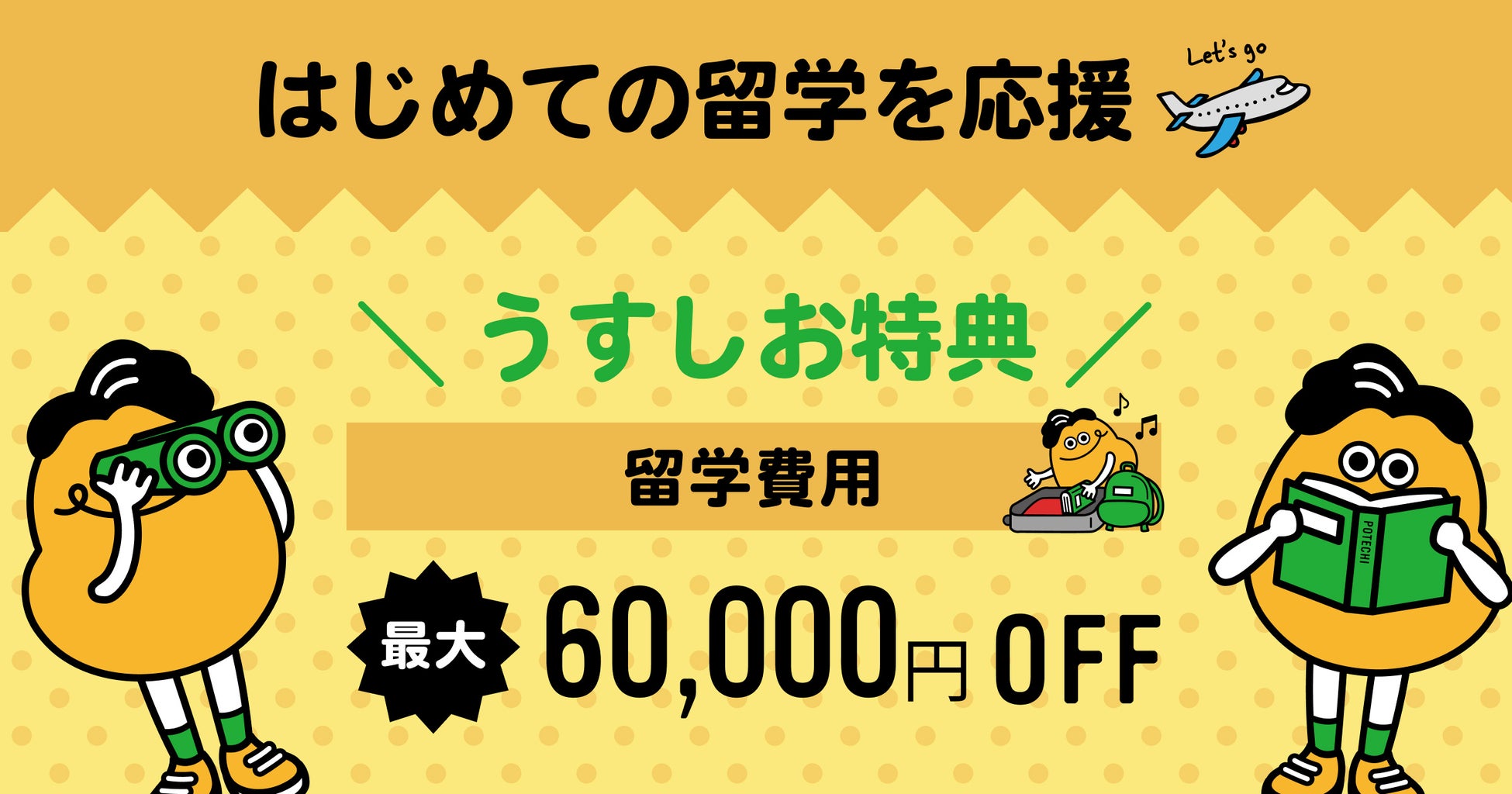 はじめての留学をお申し込みの方を対象に、留学費用が最大6万円オフになるキャンペーンを実施いたします。留学期間は8〜48週間から選択でき、期間が長ければ長いほど割引率もアップします。
