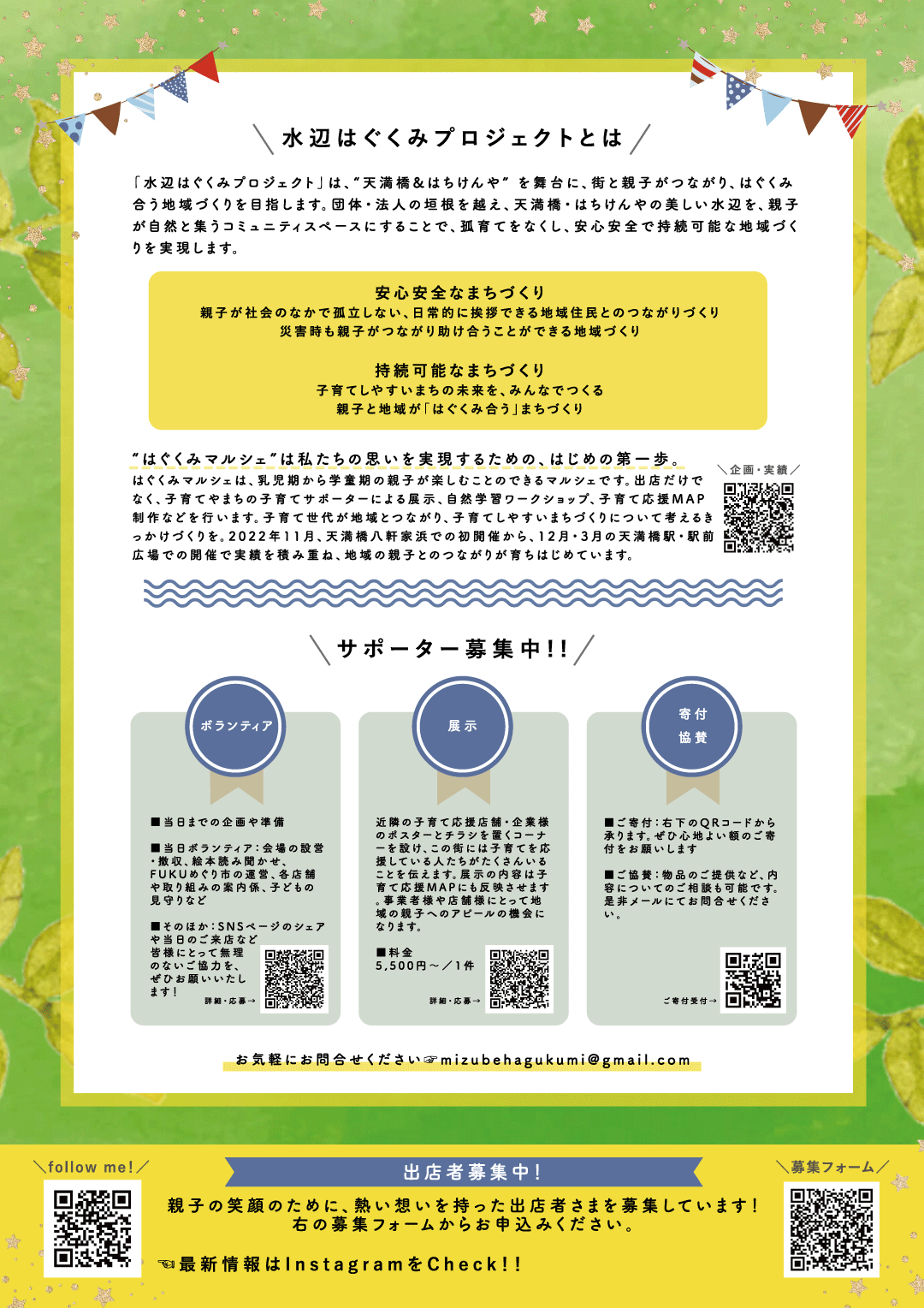 このたび、私たちの思いを実現させるための第一歩として、はぐくみマルシェを企画しました。はぐくみマルシェは、乳児期から学童期の親子が楽しむことのできるマルシェです。出店だけでなく、子育てやまちの子育てサポーターによる展示、自然学習ワークショップ、子育てMAP制作などを行います。子育て世代が地域とつながり、子育てしやすいまちづくりについて考えるきっかけづくりを行うことを目的としています。