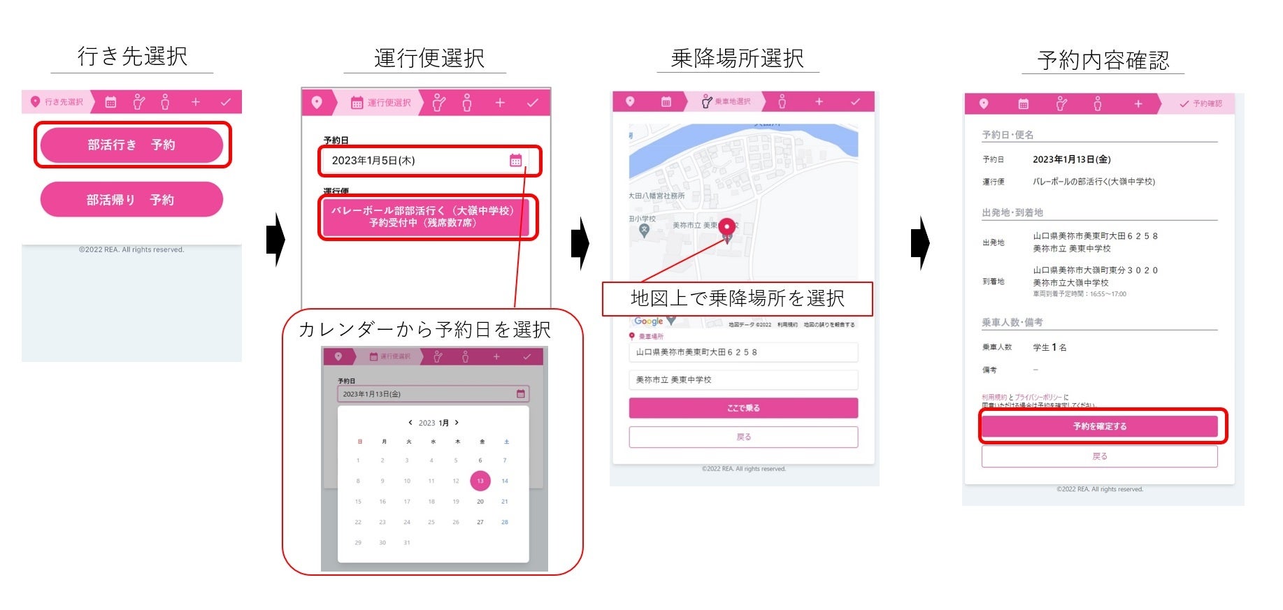 「部活動MaaS」は市内複数の中学校による合同部活動の実施にあたり会場までの生徒の送迎を乗合タクシーで運行するものです。生徒はREAが提供するAI乗合配車システムの専用予約アプリから乗車予約することができ、AIが計算した効率的なルートで各学校や自宅から会場までの間を乗合タクシーが送迎します。また、本実証では2月開催予定の市内の小中学生を対象としたスポーツイベントの送迎も実施します。