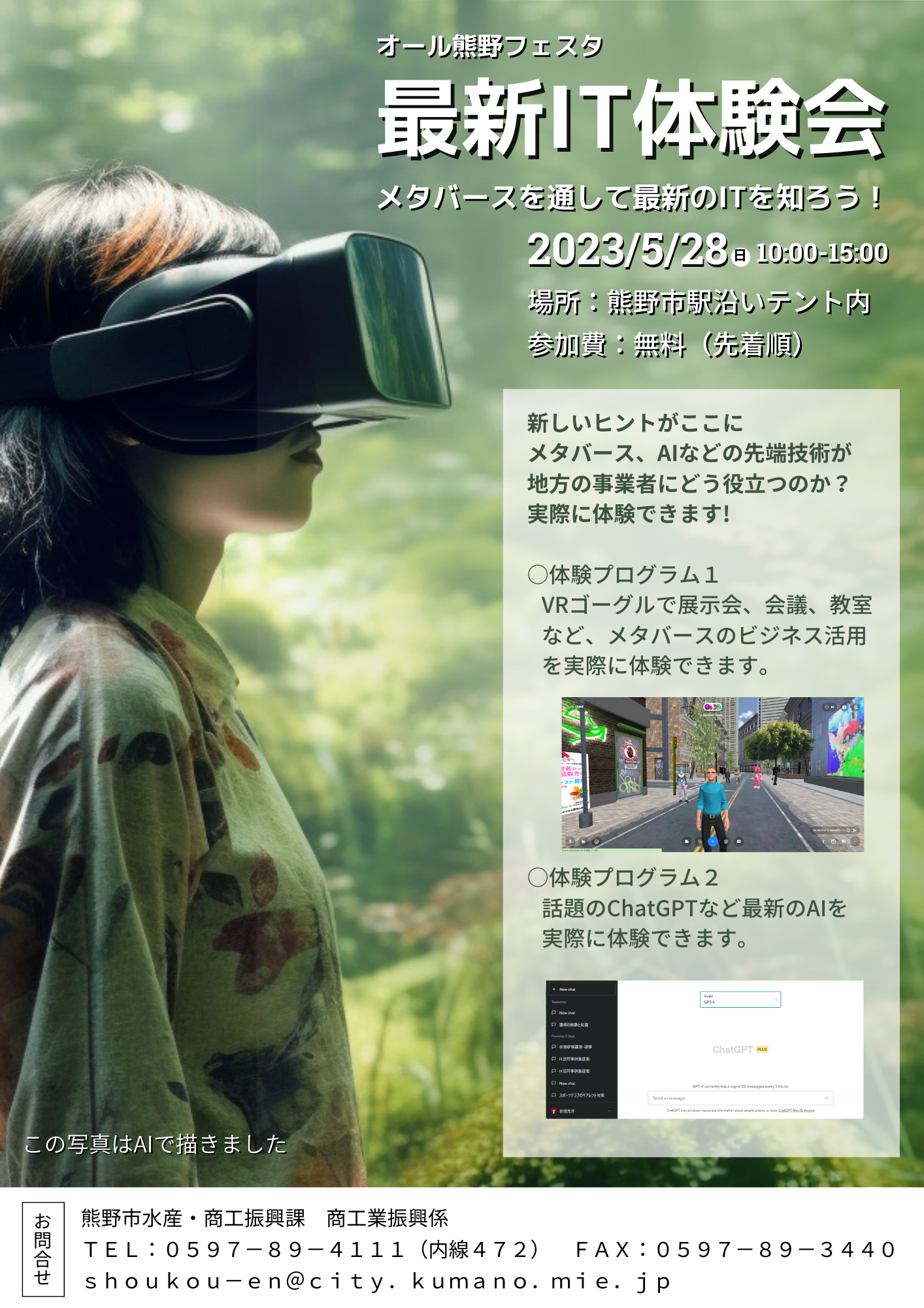 三重県熊野市 - 人口1.6万人の世界遺産にも登録されている自然豊かな熊野市は、現代の最先端テクノロジー、AIとメタバースの体験会を開催します。このイベントは、OpenAIのAI技術ChatGPT、Midjourneyと、メタバースのプラットフォームSpatialを組み合わせた未来体験の場となります。