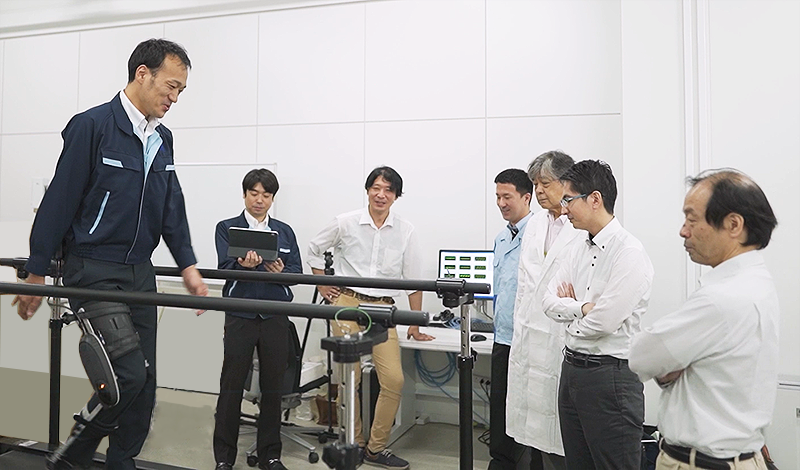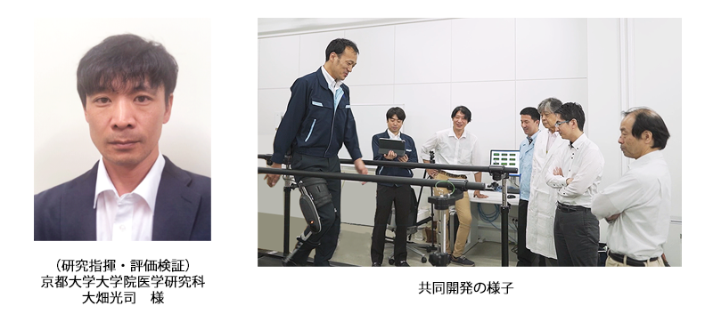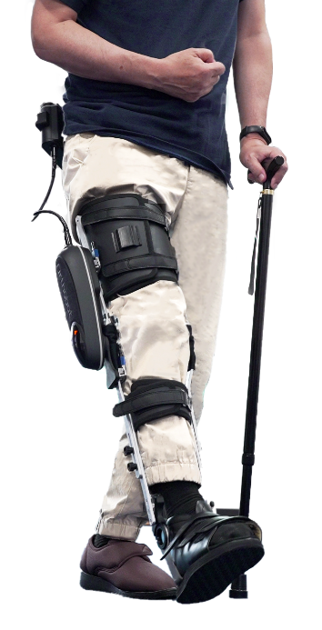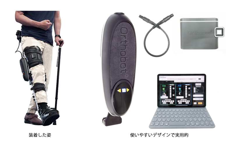 「OrthobotⓇ」(オルソボット)は、京都大学医学研究科の大畑先生(注1)の監修のもと、京都工芸繊維大学の澤田先生(注2)、佛教大学の坪山先生(注3)のご協力を得て、実用性を追究し開発した歩行学習支援ロボット。専用の長下肢装具にセットし、使用することで、装着者の歩行を本来あるべき歩行運動に誘導することができる。