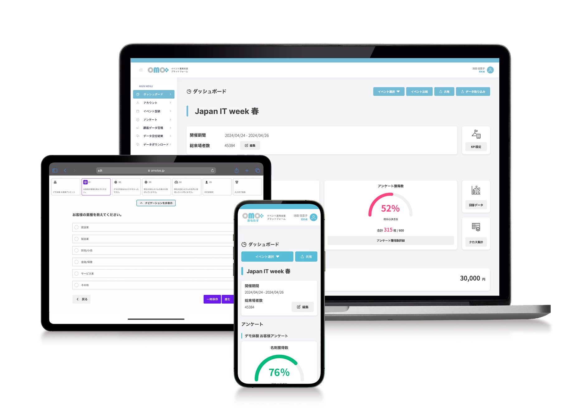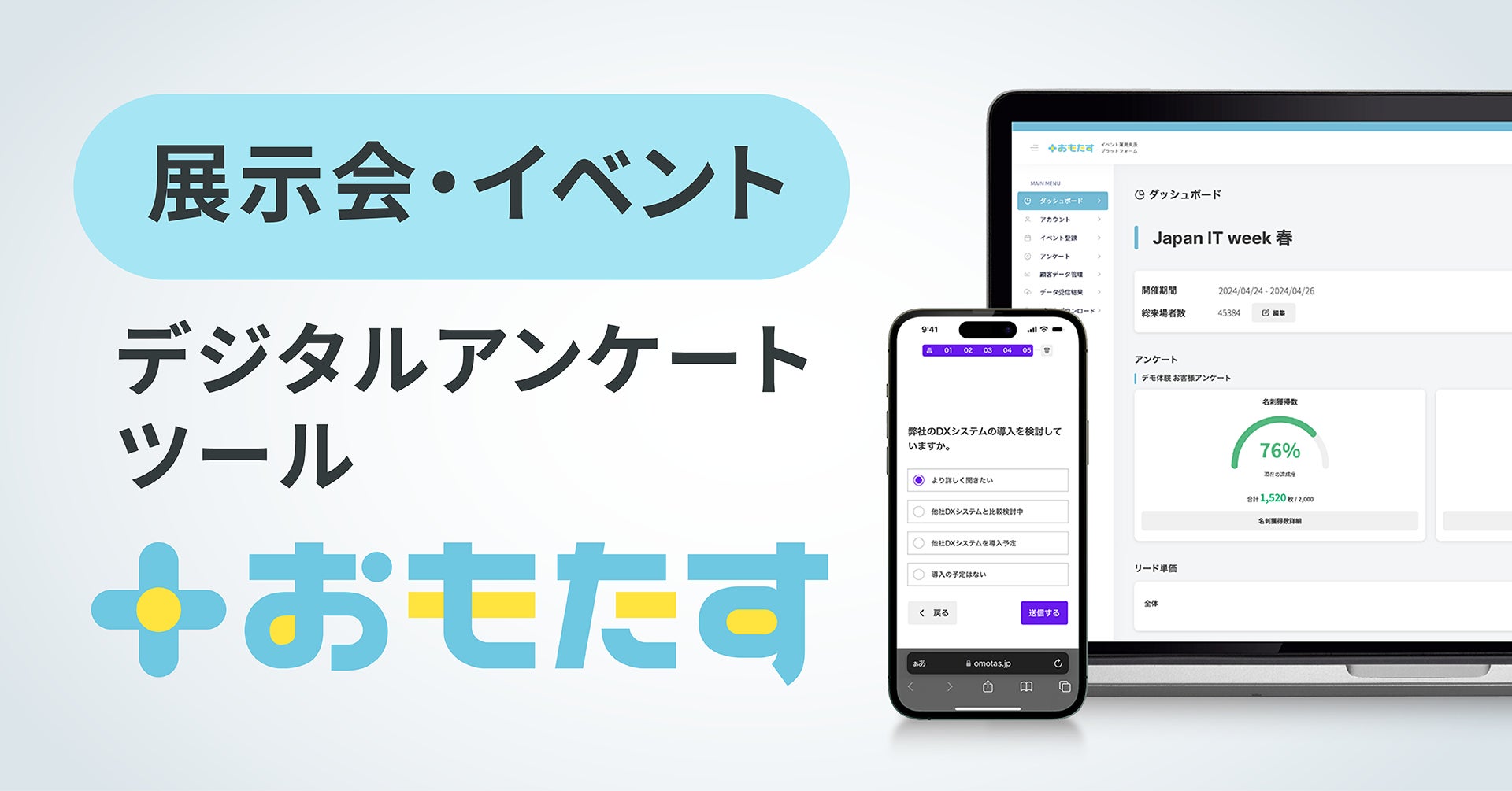 株式会社アートフリークは、4月12日にデジタルアンケート「おもたす(https://service.omotas.jp/)」のサービスサイトをリニューアルしました。出展社は「おもたす」導入により、展示会やイベント出展の費用対効果を図るためのKPIをとり、次のアクションが実行できるようになります。