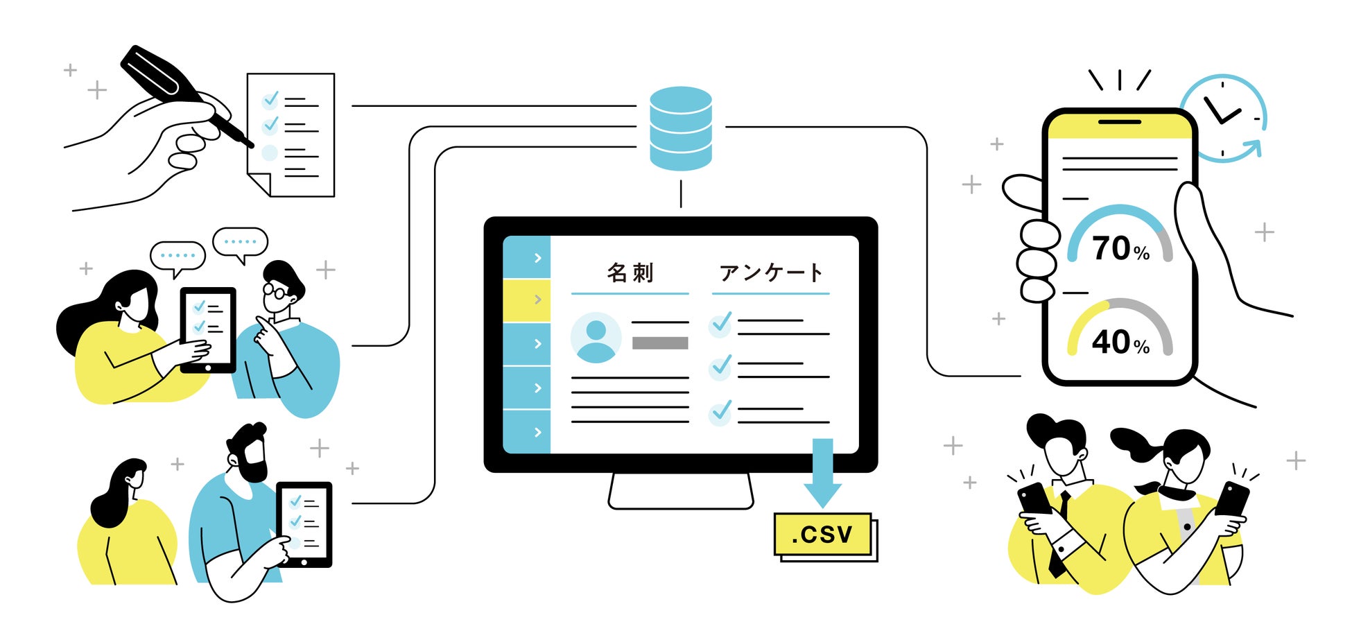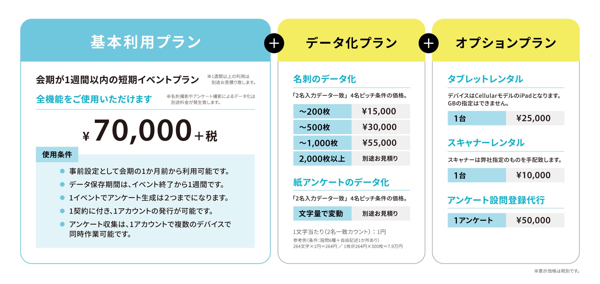 1イベントにつき70,000円で、紙アンケートや名刺のデータ化はオプションとしてご提供いたします。