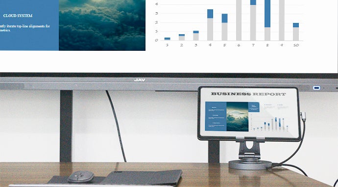 スタンドと一体化しているため、スペースを有効に活用し、デスク周りをスッキリさせます。キーボードやマウスを接続すると、スマホ・タブレットの作業をもっと快適に!