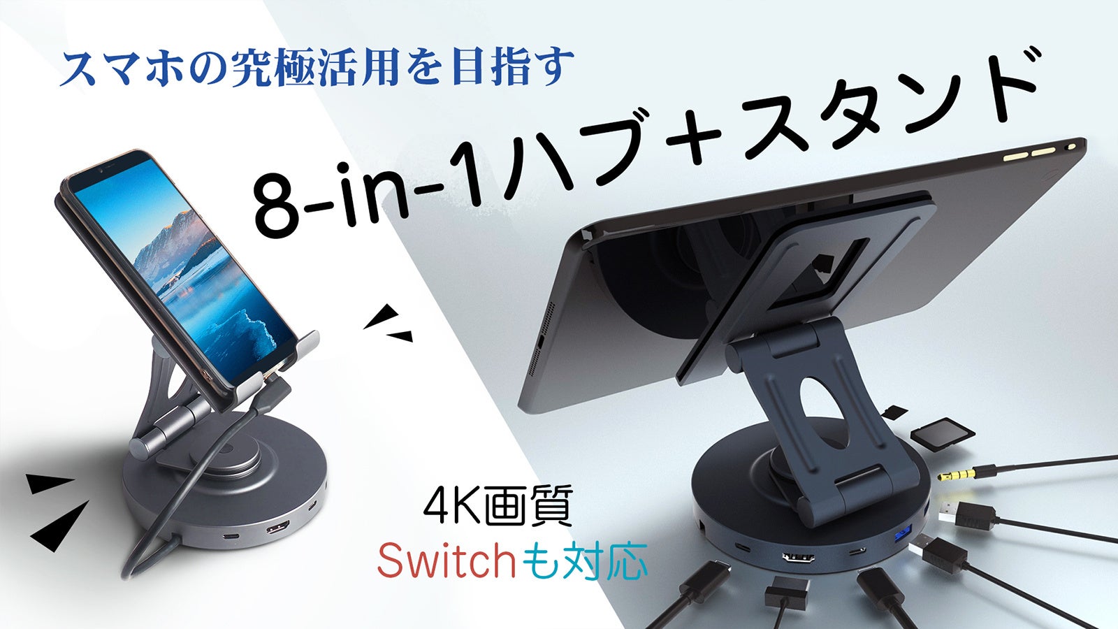 【新商品】スマホの究極活用へ!HUBとスタンドが合体した 回転・角度調整できる8-in-1ドッキングステーション