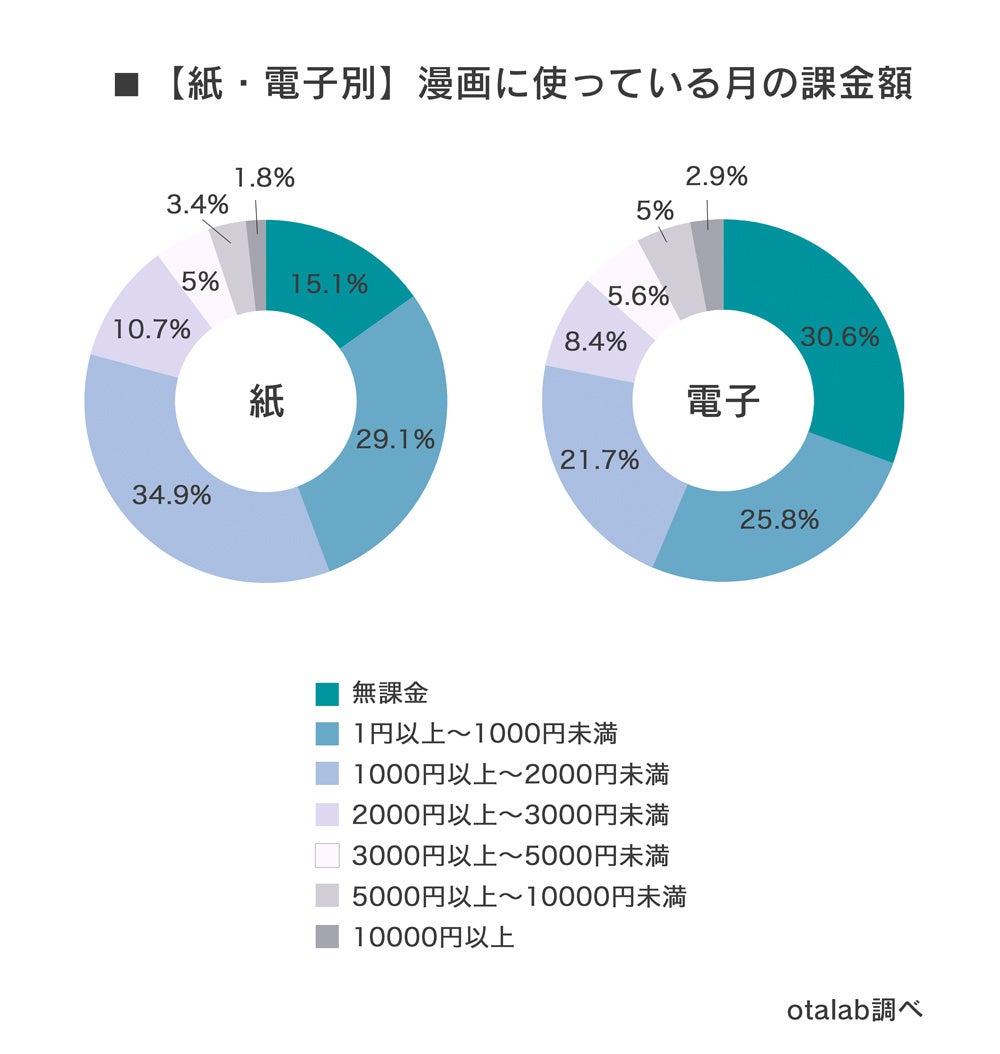 紙・電子の利用者の両方に月の課金額についてアンケート調査を行った結果、紙は「1000円以上~2000円未満」が最多の34.9%、電子書籍では「無課金」が最多の30.6%となった。