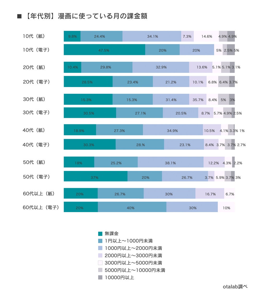 電子書籍の場合、無料で読める作品も多く、気軽に読みやすいという特徴があるため無課金での利用者の割合が高くなり、一方で紙で漫画を読む場合は書店などに訪れる必要があるため、電子で読む人に比べてそもそもの購買意欲が高いことが想定される結果となった。