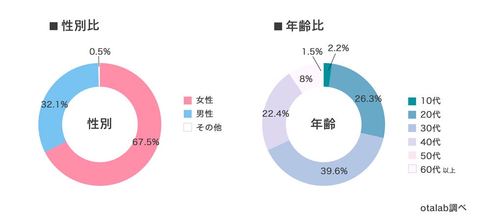 男女比は女性が最多の67.5%、年齢の比率は30代が最多の39.6%となっている。