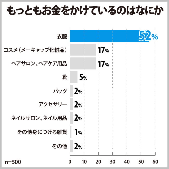 ファッション・アパレルの中で最もお金をかけるアイテムについても聞いたところ、「衣服」がトップで半数を占めています。