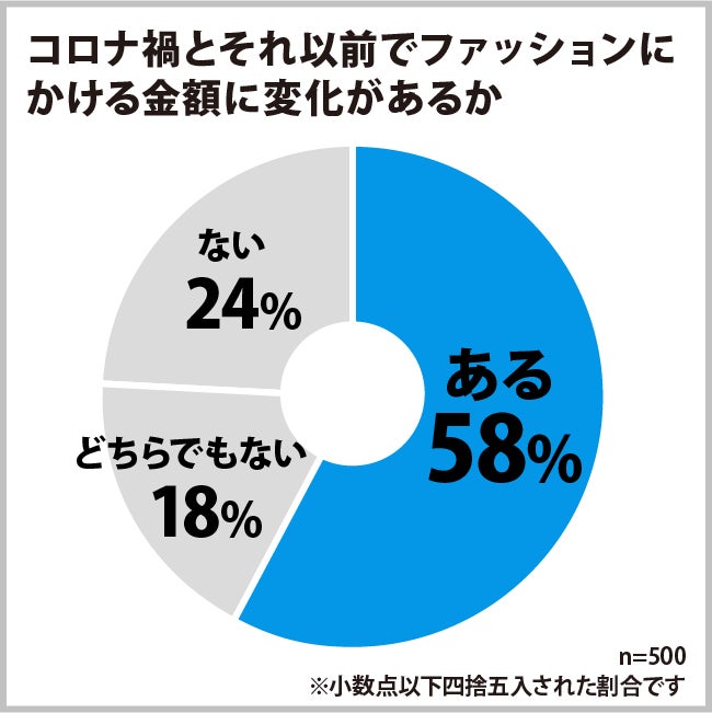 コロナ禍とそれ以前でファッションにかける金額が変わったか聞いたところ、およそ6割の人が「変化がある」と答えています。