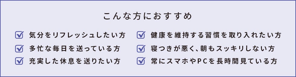 毎日が忙しいと感じる人のリラックスタイムを整え、不規則な生活やストレスによって失われがちな栄養素を補います。スマホやPCと向き合い続ける人のコンディションを優しくサポートします。