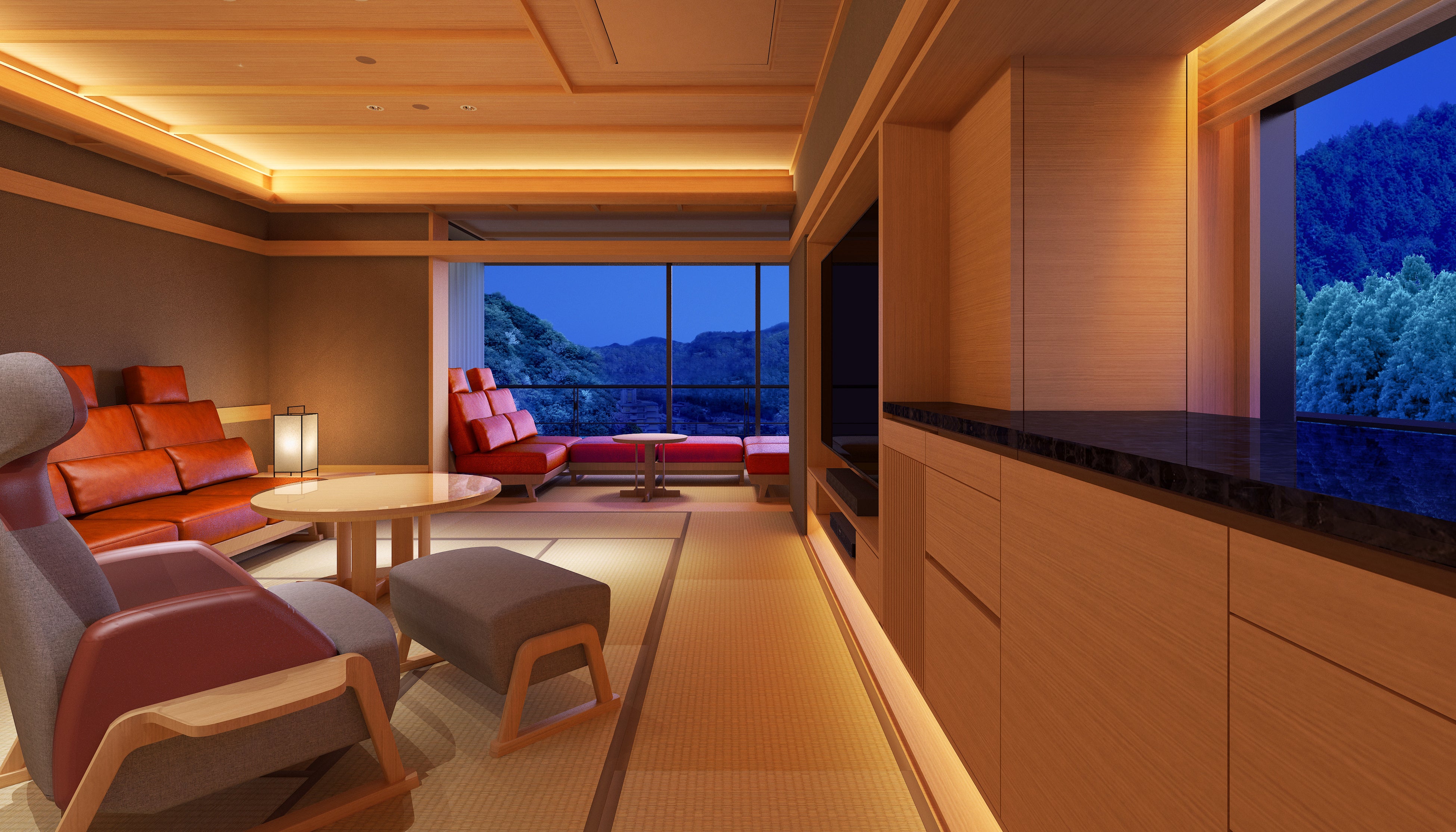 その集大成ともいえる客室、銀泉露天貴賓室「貴舟」が西館7階角部屋に、広さ150平米の充実した最新設備の数々を揃えて誕生します。