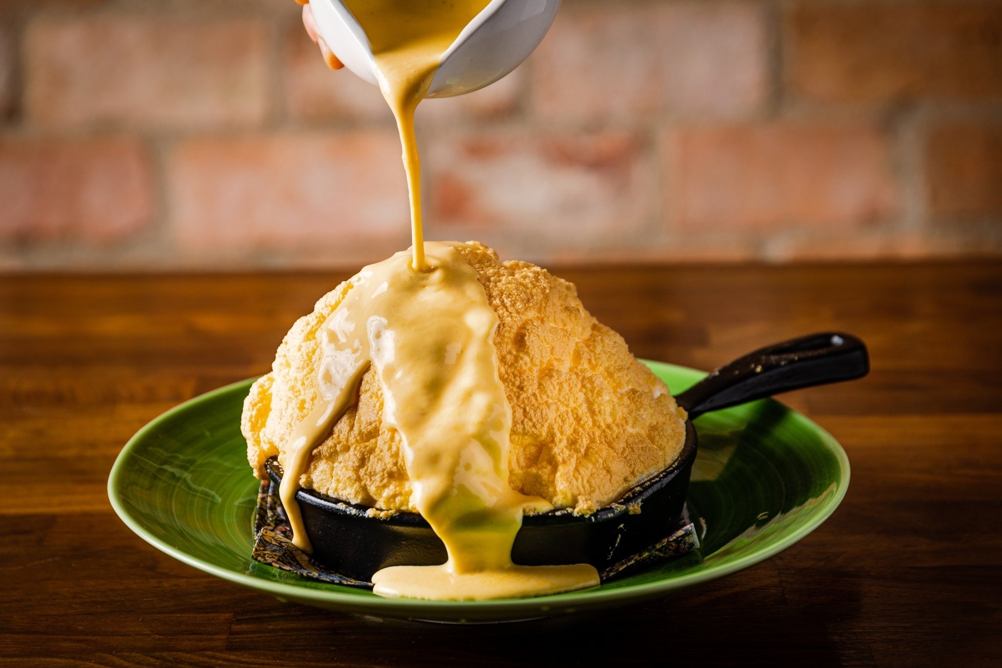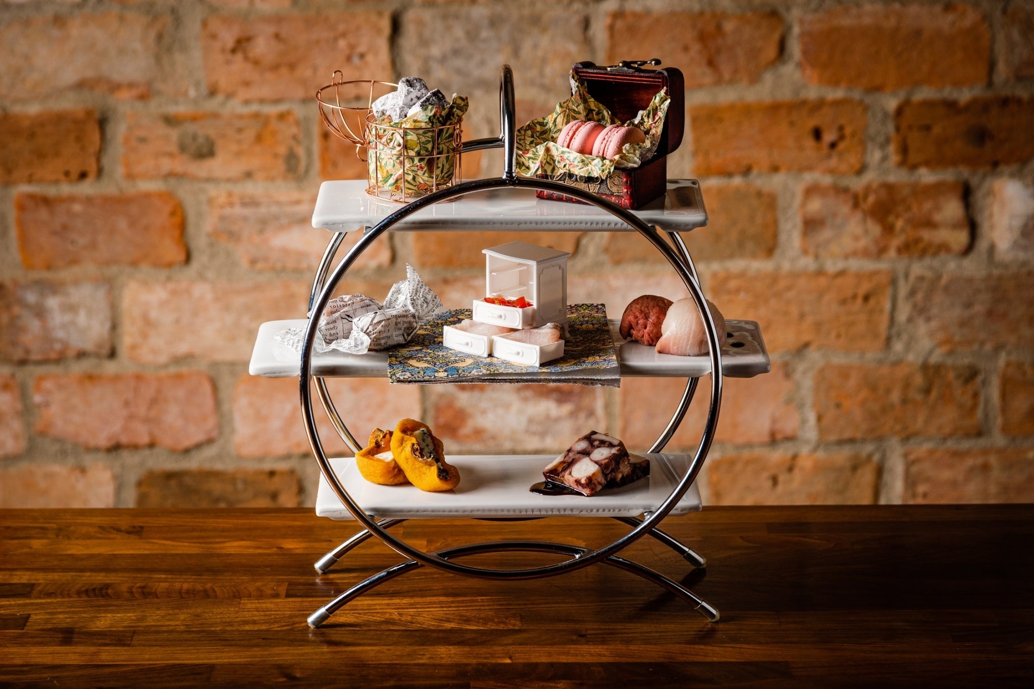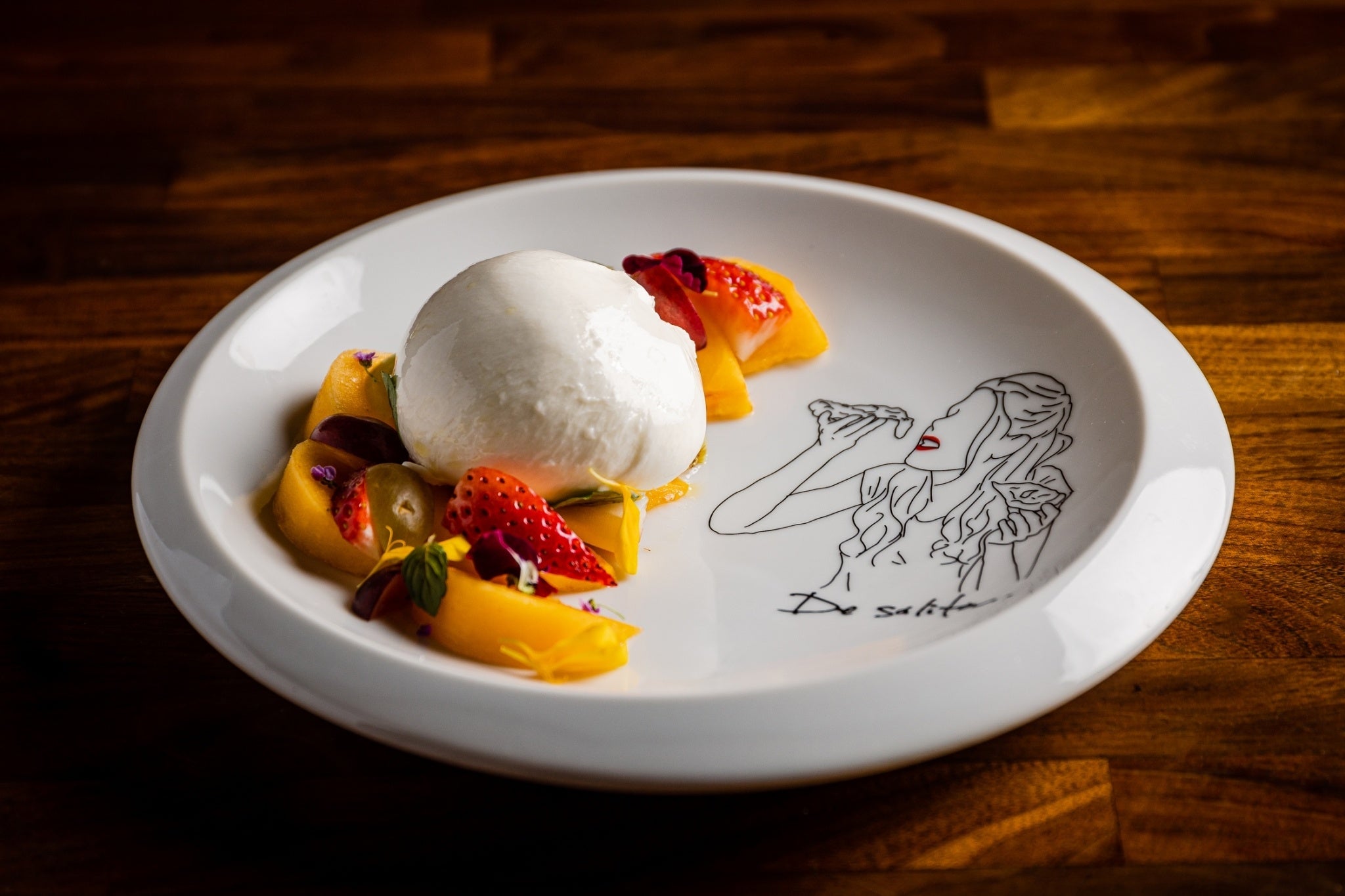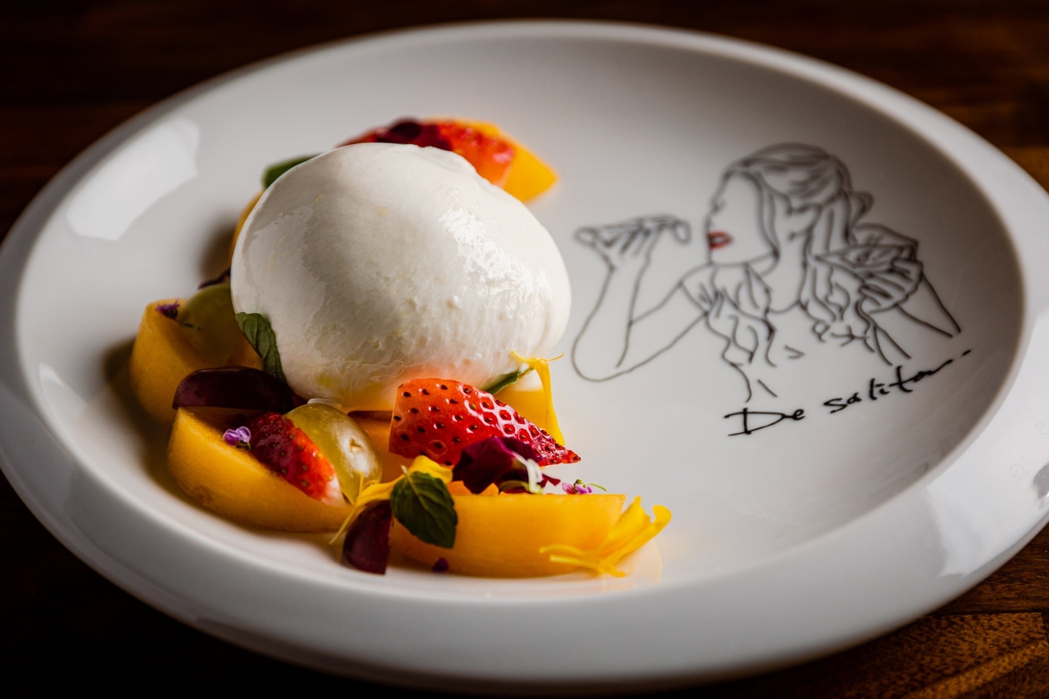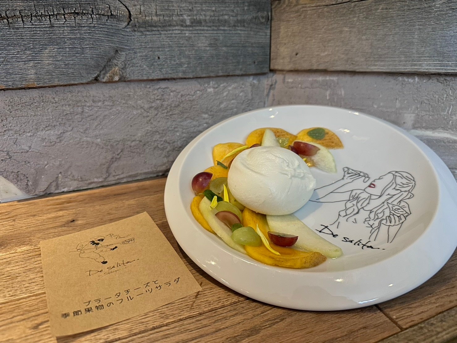 お皿にデザインされた「ブラータチーズと季節果物のフルーツサラダ」はおやつ変わりにも目でも楽しんでいただけます。その他モンブラン風に目の前で仕上げる「ベーコンエッグポテトサラダ」は思わずスマホをとってしまう一皿。