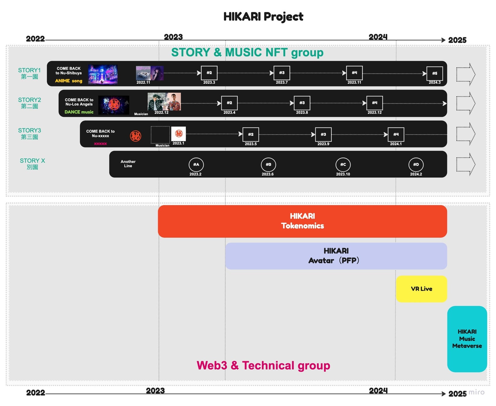 「HIKARI」という星を舞台にAIと人間、クリエイティビティ(文化)といった側面で物語が進んでいくストーリー。現在発表されているのは「メインストーリー」とそこから派生していく「第一群:Come Back to Nu-Shibuya」。それぞれのストーリーごとにテーマとなるアーティストやプロデューサー、音楽が設定されており、1つのストーリーが気に入れば音楽だけ聞いていても楽しいし、たとえば物語だけを追っていくような楽しみ方も可能になっている。ストーリーをどのように作っていくかはDiscordコミュニティでこれから明らかにされていく。