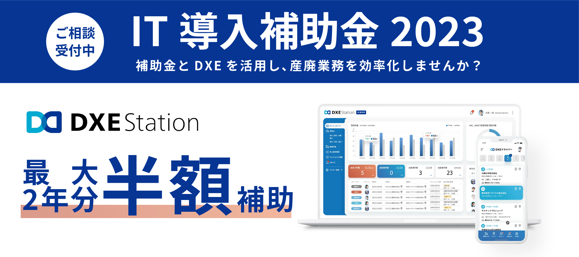 今般ITツールとして認定された「DXE Station/月額55,000円(税込)~」は、産業廃棄物の排出から処理まで、電子マニフェスト起票、売上請求管理ならびに配車業務の一連の業務プロセスをクラウド上で一括デジタル管理するSaaSサービスとなります。電子マニフェストの代行起票や作業負担の軽減で各事業者様の業務を劇的に効率化することが可能となります。
