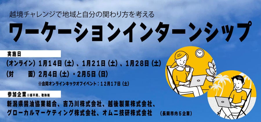長岡市内企業5社による合同インターンシップを現地とオンラインのハイブリッドプログラムで実施いたします。