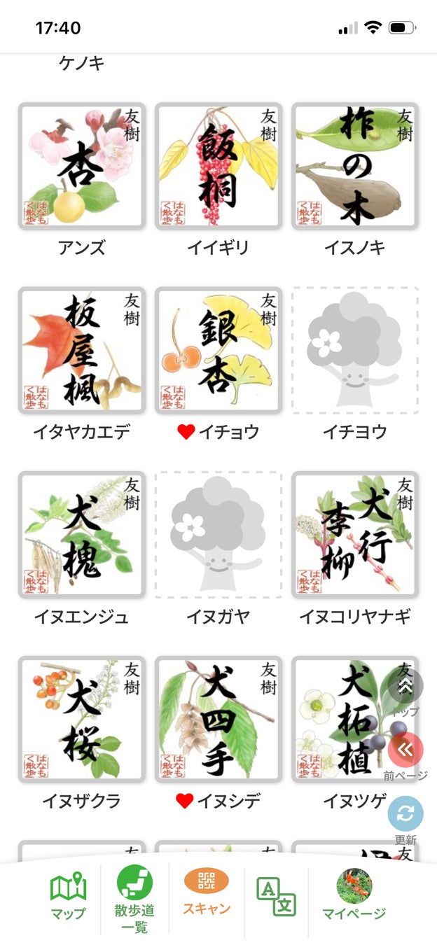 はなもく散歩にログインをしてQRコードを読むと、マイページの「御樹印帳」に「御樹印」をためていくことができます。