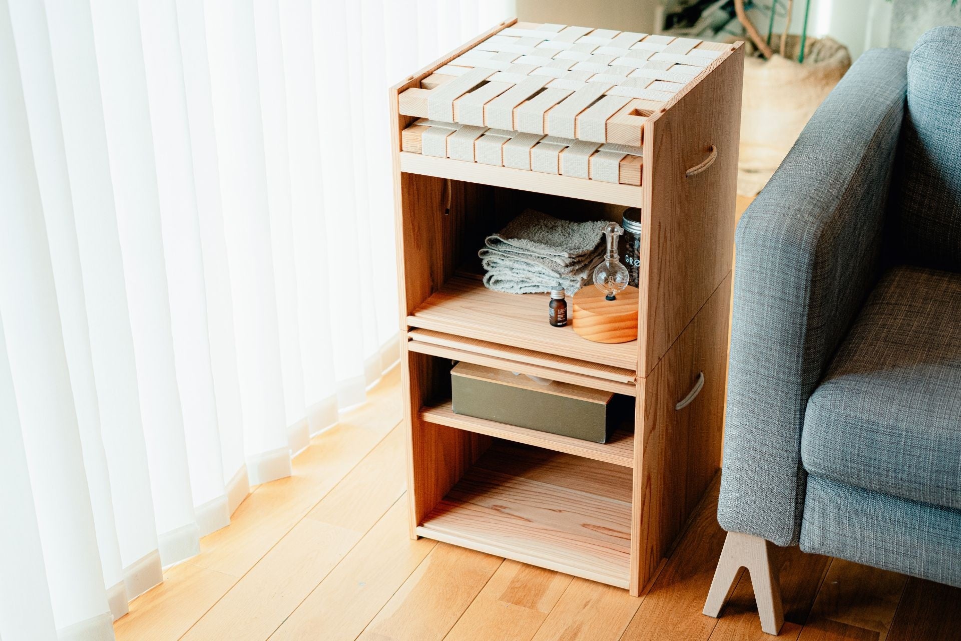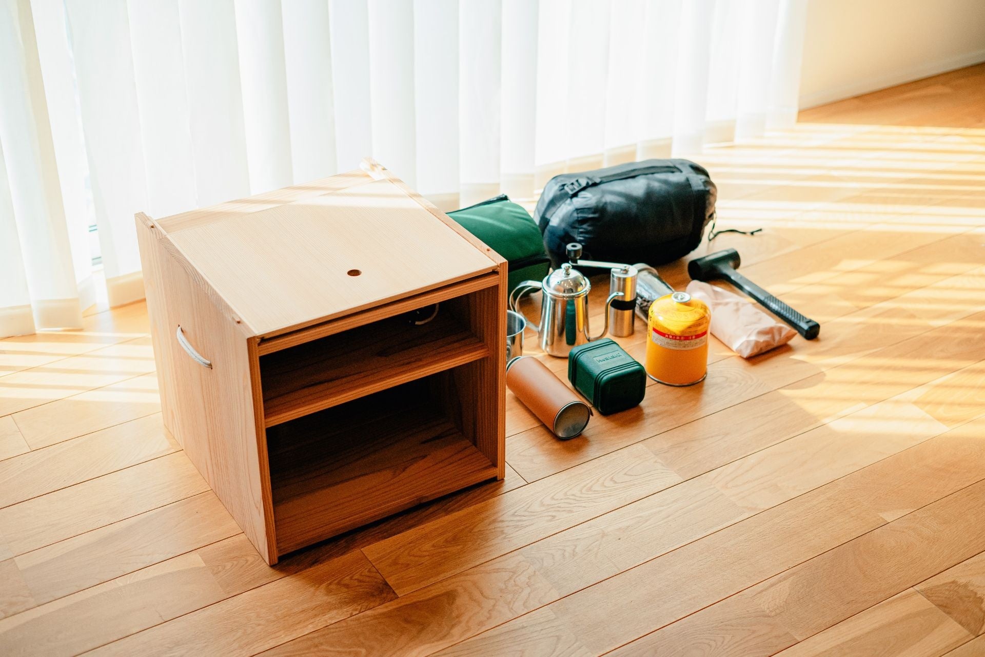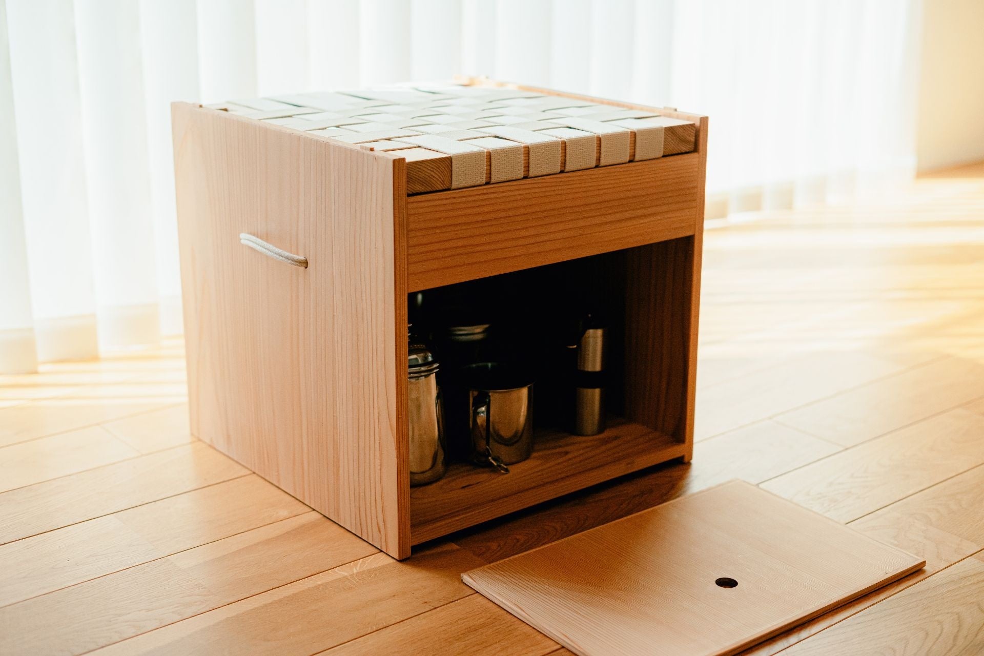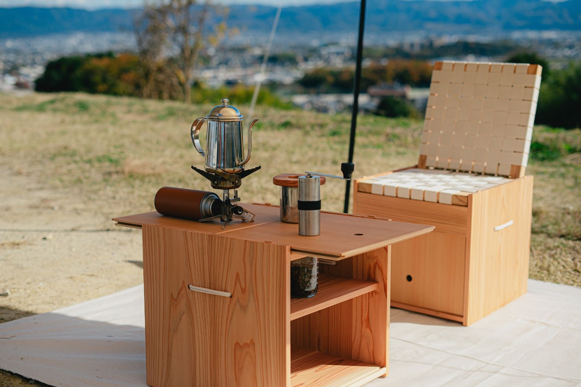 一生使える道具を基本思想に、キャンプギアと家具の両面を合わせ持つ、シェルフ(棚)・コンテナボックス・テーブルまたはチェアの3役を実現する新しいシステムを開発し、木目が美しく、軽くて丈夫な奈良県産吉野杉で製品化。